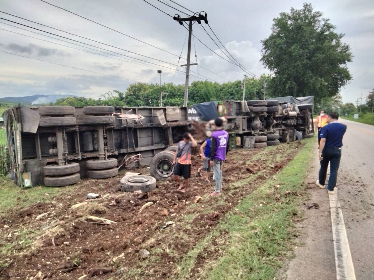 รถพ่วงขนถ่านหินลิกไนต์ เสียหลักพลิกคว่ำลงข้างทาง โชคดีไร้คนเจ็บ