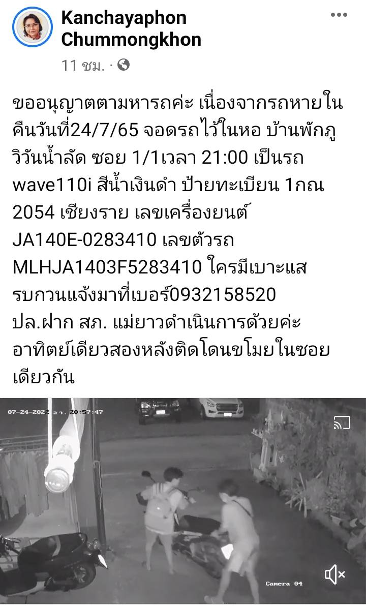 คลิปดังกล่าว ถูกนำมาเผยแพร่โดยผู้ใช้เฟซบุ๊กชื่อ “Kanchayaphon Chummongkhon” โดยมีข้อความตามโพสต์ระบุว่า “ขออนุญาตตามหารถค่ะ เนื่องจากรถหายในคืนวันที่ 24/7/65 จอดรถไว้ในหอ บ้านพักภูวิวันน้ำลัด ซอย 1/1 เวลา 21.00 น. เป็นรถ wave110i สีน้ำเงินดำ ป้ายทะเบียน 1กณ 2054 เชียงราย ใครมีเบาะแสรบกวนแจ้งมาที่เบอร์0932158520 ปล.ฝาก สภ. แม่ยาว ดำเนินการด้วยค่ะ อาทิตย์เดียวสองหลังติดโดนขโมยในซอยเดียวกัน”