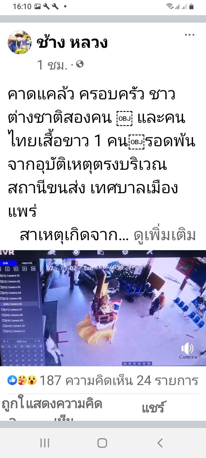 คลาดแคล้ว ครอบครัว ชาวต่างชาติสองคน และคนไทยเสื้อขาว 1 คนรอดพ้นจากอุบัติเหตุตรงบริเวณสถานีขนส่ง เทศบาลเมืองแพร่ สาเหตุเกิดจากเหยียบเบรคกลายเป็นคันเร่ง เดชะบุญไม่มีใครรับบัตรเจ็บมากมีแม่บ้านได้รับบาดเจ็บเล็กน้อย (เหตุเกิดเมื่อเวลาบ่ายโมง เศษ วันอังคารที่ 26 กรกฎาคม 65)