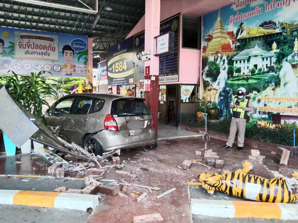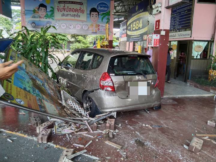ต่อมาผู้สื่อข่าวจึงได้ลงพื้นที่ไปสอบถาม นายประยุทธ เหมืองจา อายุ 53 ปี เจ้าหน้าที่ประจำสถานีขนส่งเผยว่า ระหว่างที่ตนเองนั่งทำงาน ได้ยินเสียงดังตูมดังมาก จากนั้นเห็นถอยถอยหลังเข้ามาในเก้าอี้ที่พักผู้โดยสาร ด้วยความเร็วสูง จนคนที่อยู่บริเวณนั้นแตกกระเจิง รถได้พุ่งขนเก้า พร้อมบลอกประสานที่ตกแต่งป้ายบอกสถานที่ต่างๆ ก่อนจะพุ่งชน รูปปั้นเสือที่ตกแต่งต้อนรับนักท่องเที่ยว กระเด็นไปโดน นางพิน(นามสมมุติ) แม่บ้านที่ทำความสะอาดบาดเจ็บเหล็กน้อย