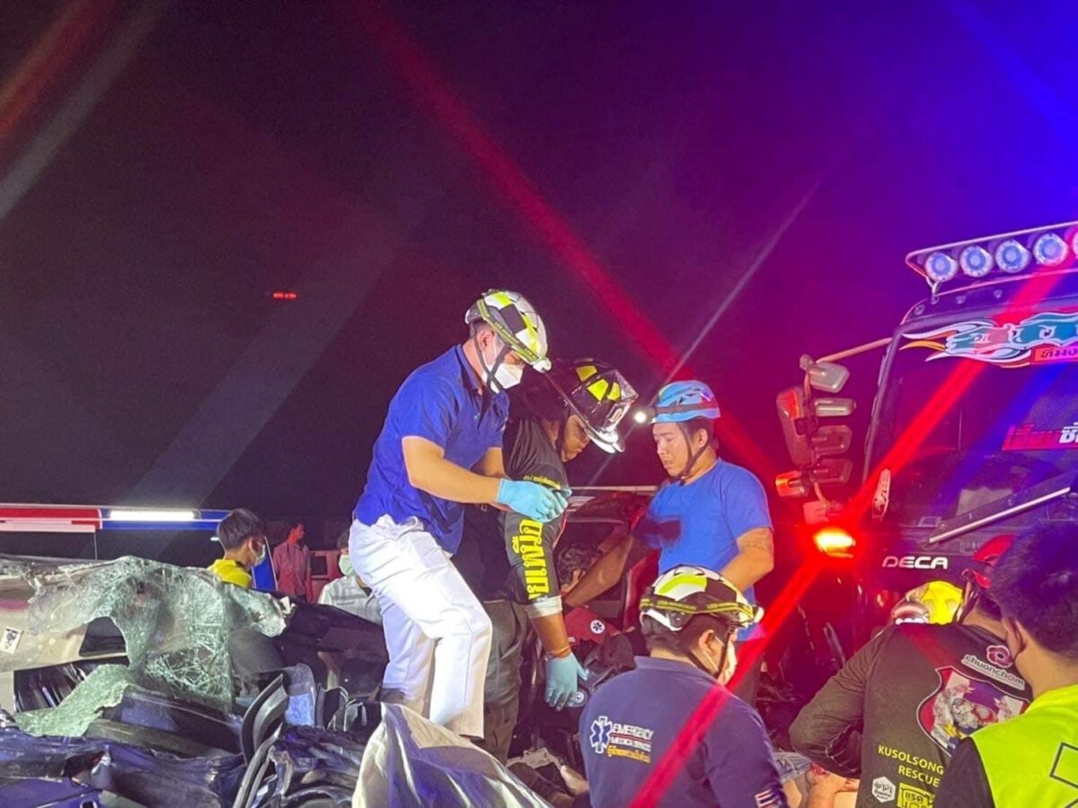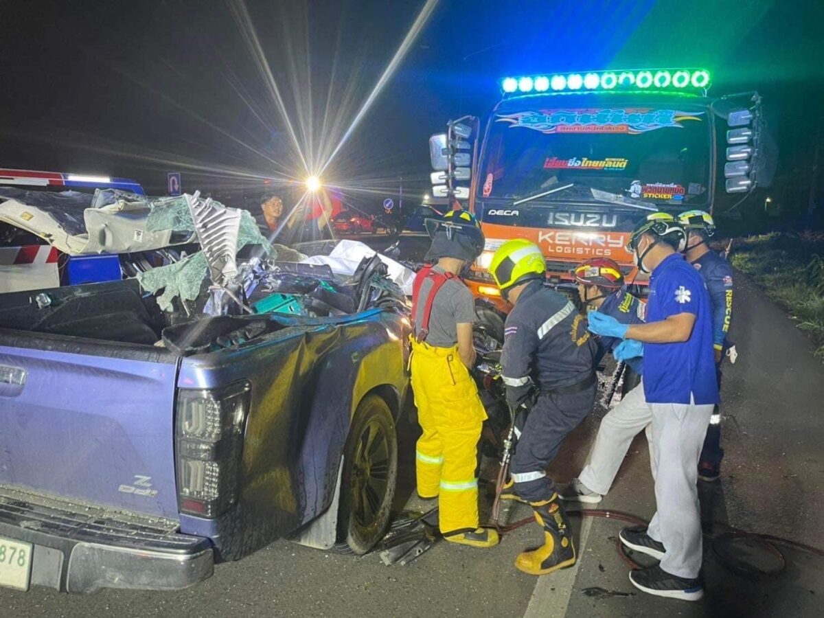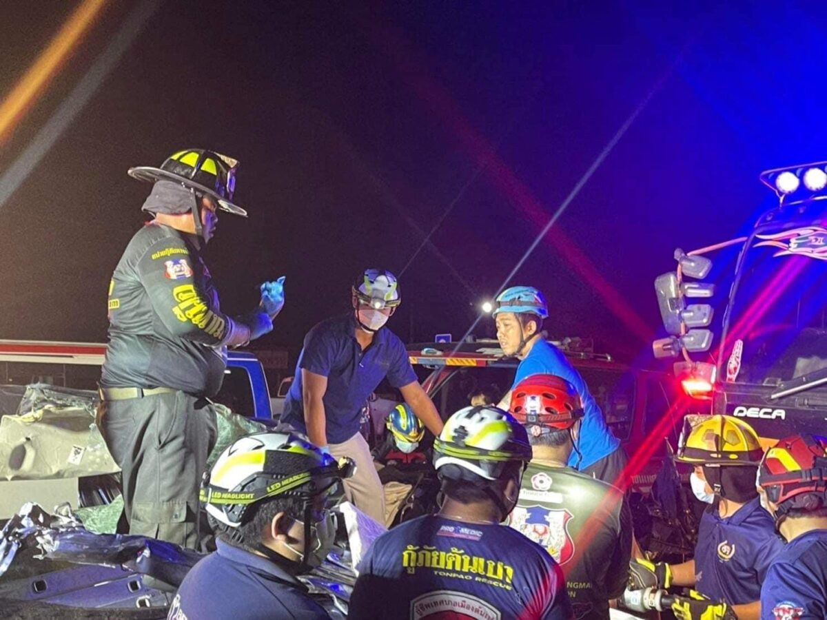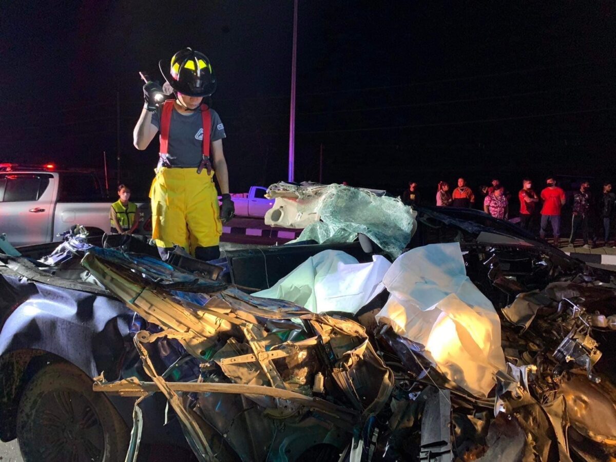 พบว่าในที่เกิดเหตุเป็นจุดยูเทิร์น(กลับรถ) มีรถยนต์กระบะยี่ห้ออีซูซุ สีฟ้า ทะเบียน สระแก้ว ชนอัดก้อปปี้กับรถบรรทุกยี่ห้ออีซูซุ สีส้ม ทะเบียน เชียงใหม่(รถเคอรี่) มีชายคนขับรถยนต์กระบะติดคาพวงมาลัย ทางกู้ชีพฯทม.ต้นเปาใช้เครื่องตัดถ่างช่วยนำตัวคนขับออกมา ปรากฎว่าทนพิษบาดแผลไม่ไหวเสียชีวิตในที่เกิดเหตุ ทางพนักสอบสวนสภ.สันกำแพง ได้มอบหมายให้กู้ชีพฯนำศพส่งนินิเวชรพ.มหาราชนครเชียงใหม่ ส่วนสาเหตุอยู่ระหว่างการสอบสวน