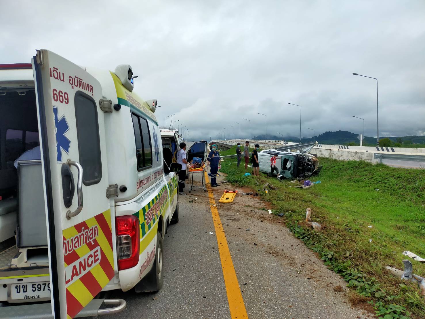 เมื่อเวลา 08.19 น. วันที่ 14 ก.ย. 65 กู้ภัยเทศบาลตำบลท่าสุด ได้รับแจ้งเหตุรถเก๋งเสียหลักพลิกคว่ำ มีผู้ได้รับบาดเจ็บ 2 ราย พื้นที่สะพานข้ามแม่น้ำกก ฝั่ง ต.ดงมหาวัน อ.เวียงเชียงรุ้ง จ.เชียงราย จึงจัดเจ้าหน้าที่และอุปกรณ์ออกไปทำการช่วยเหลือ