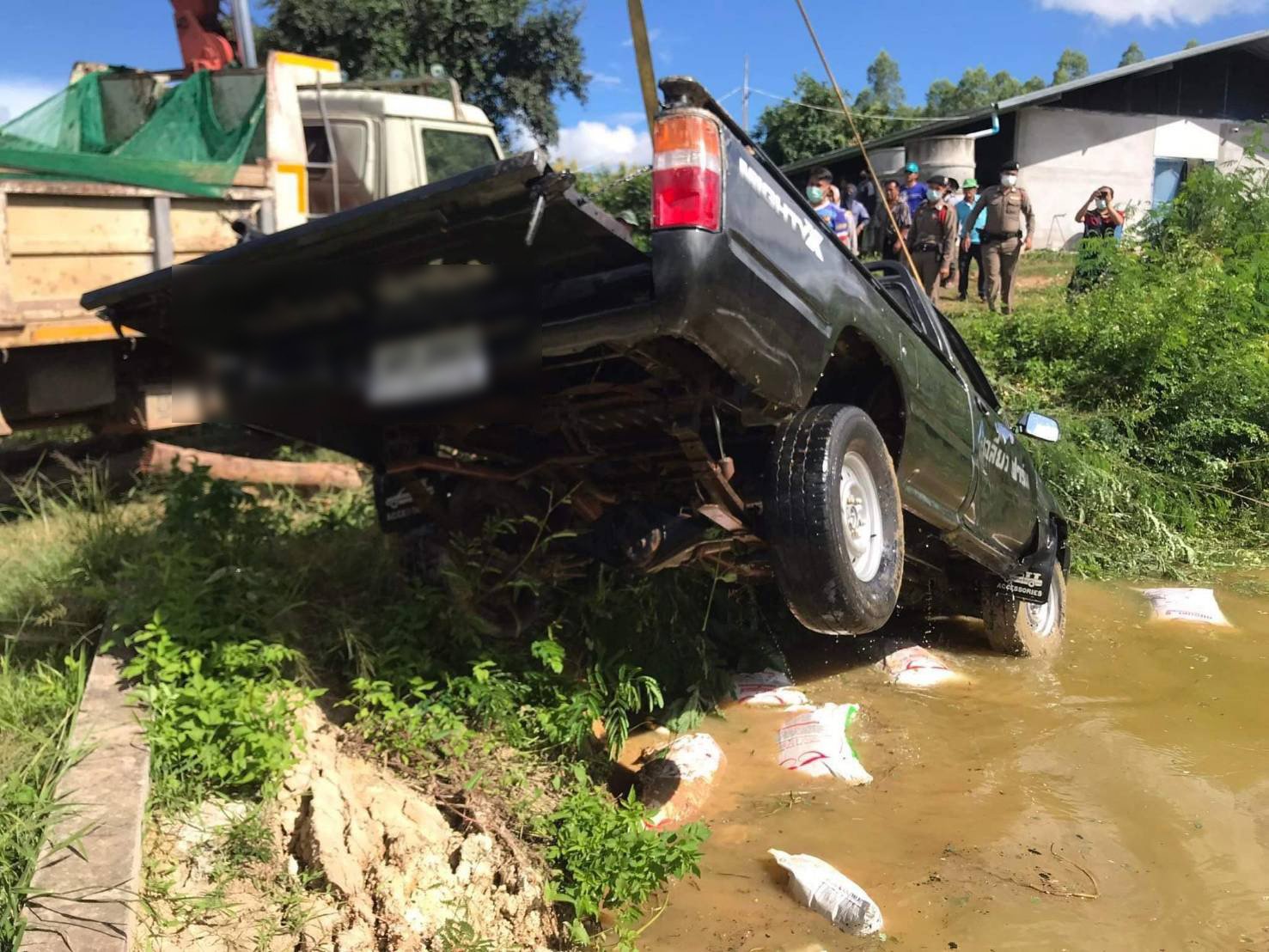 จากการสอบสวนในเบื้องต้นทราบว่า ขณะเกิดเหตุ ผู้ตายได้ขับรถกระบะบรรทุกอาหารหมูที่บรรจุในกระสอบ ส่วนหนึ่งนำไปเก็บไว้คอกหมู่ที่อยู่ด้านบน โดยให้คนงานชายหนึ่งคนเป็นคนขนลงจากรถ และเหลืออีกส่วนหนึ่งเพื่อนำลงมาเก็บไว้ที่คอกหมูด้านล่าง และได้ขับรถถอยรถลงสระน้ำอย่างแรง ที่มีความลึกประมาณ 3เมตร จนรถจมลงในสระ ขณะเกิดเหตุมีคนงาน และภรรยาผู้ตายเห็นเหตุการณ์ จึงได้รีบวิ่งเข้าไปช่วยพยายามที่จะดึงแขนออกจากตัวรถ แต่ด้วยน้ำค่อนข้างลึก ไม่สามารถช่วยเหลือออกมาได้ ทำให้เสียชีวิตคาที่นั่งคนขับดังกล่าว จากนั้นจึงรีบแจ้งเจ้าหน้าที่ตำรวจ