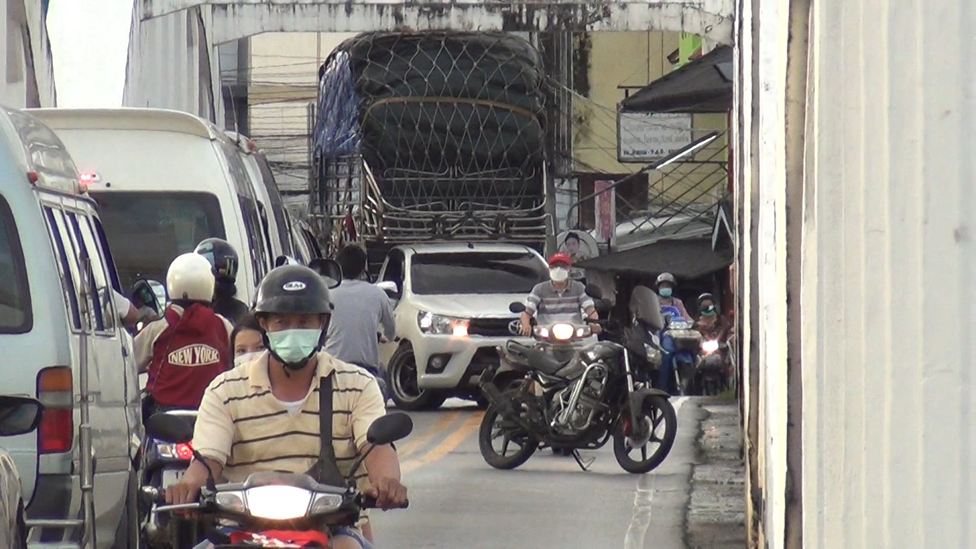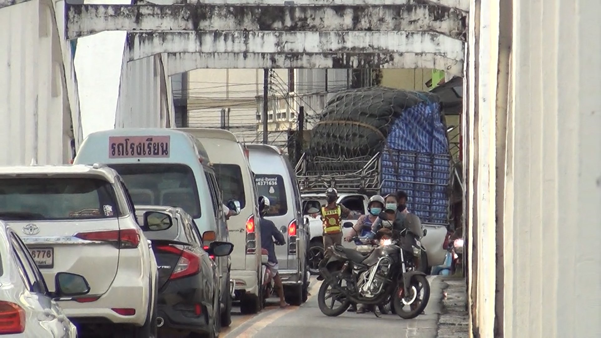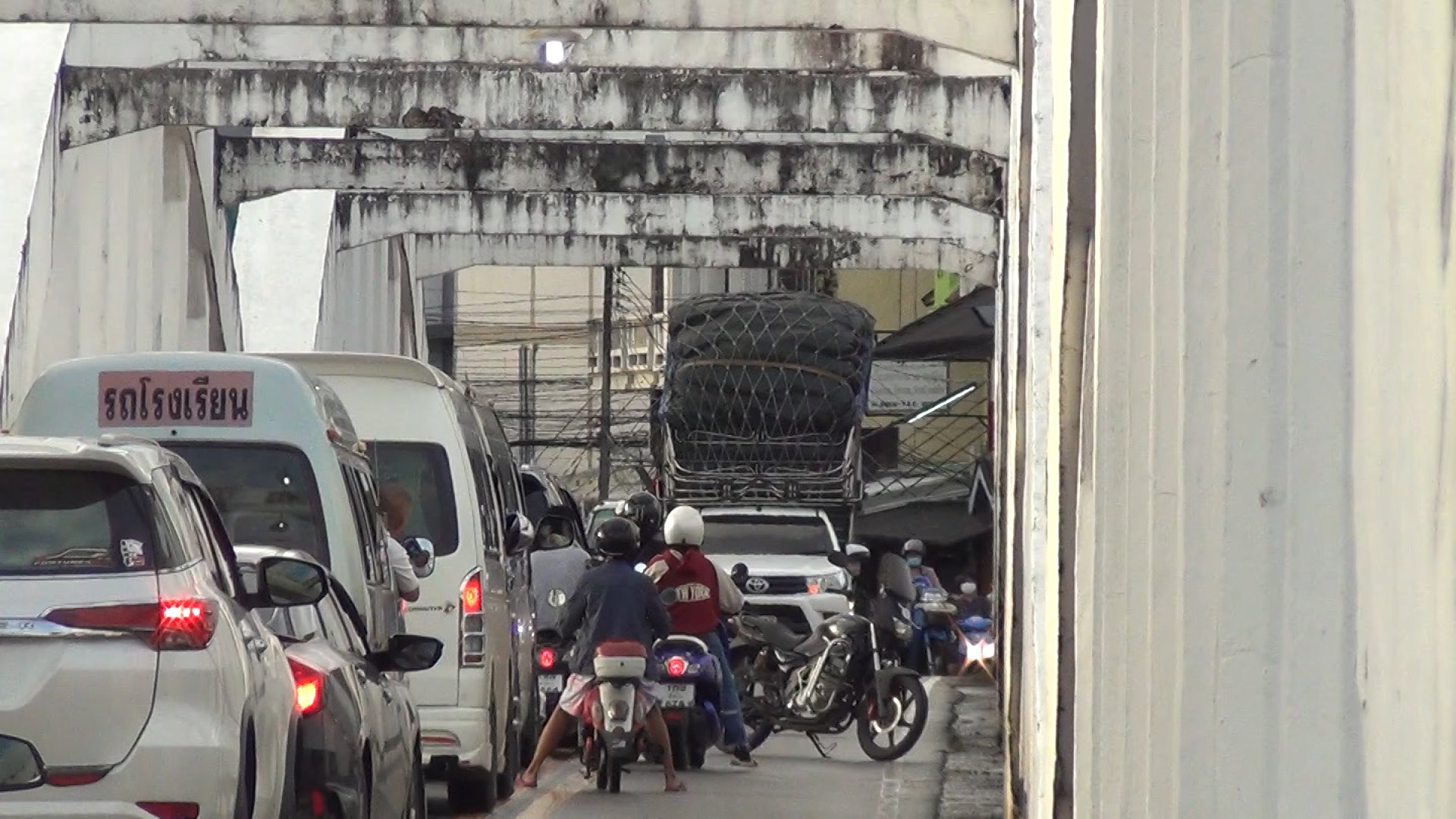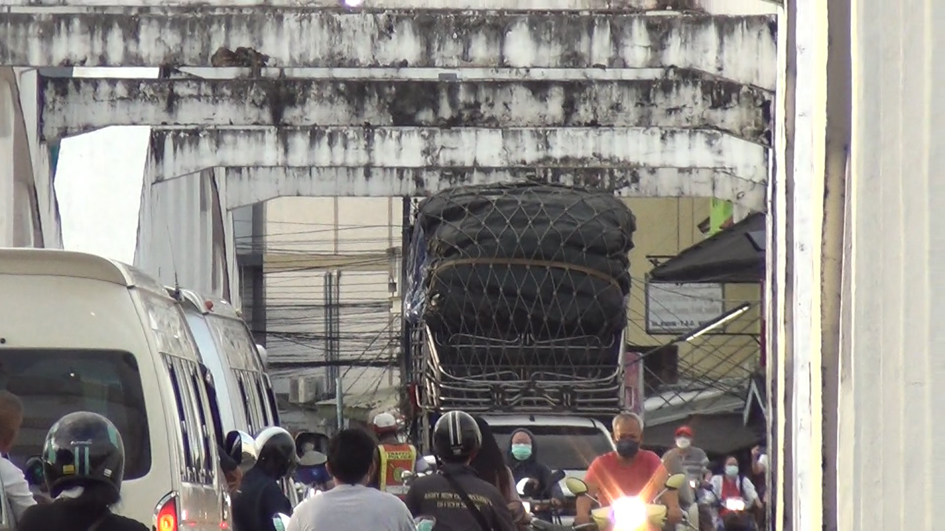 รถกระบะบรรทุกสินค้าสูงเต็มหลังรถ ชนคานสะพานรัษฎาภิเศกอีก ตำรวจจราจรสกัดให้ถอยออกทันที พบเป็นรถต่างจังหวัด คาดไม่ชำนาญเส้นทาง
