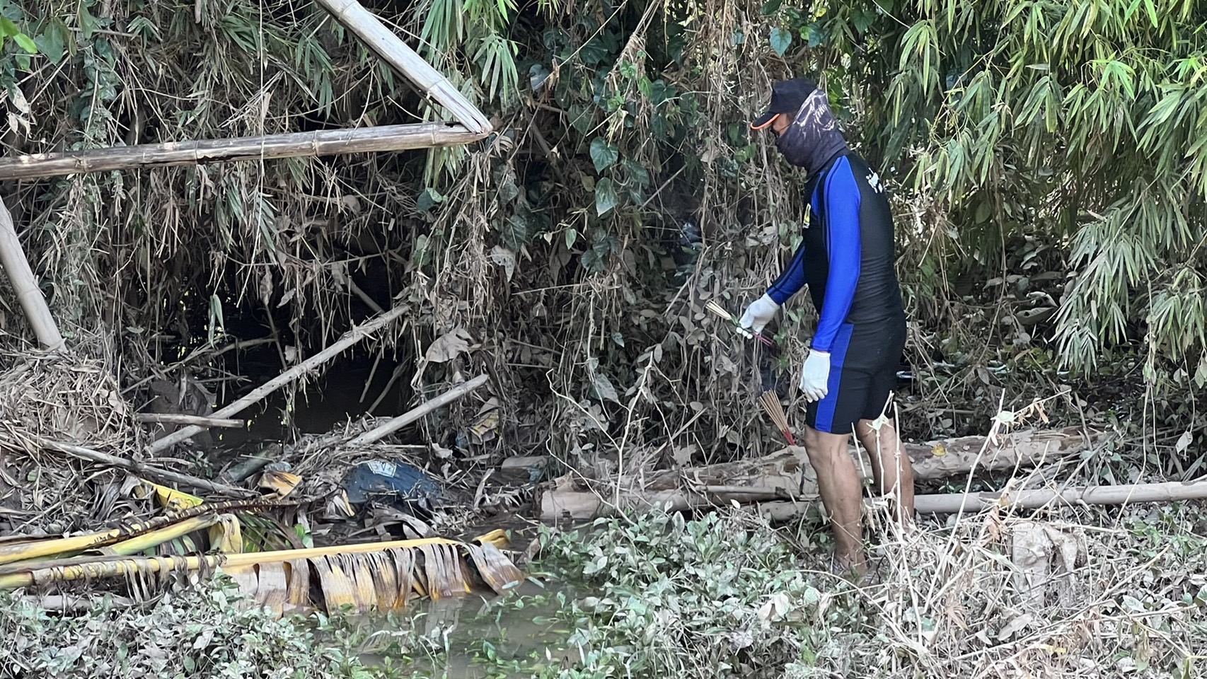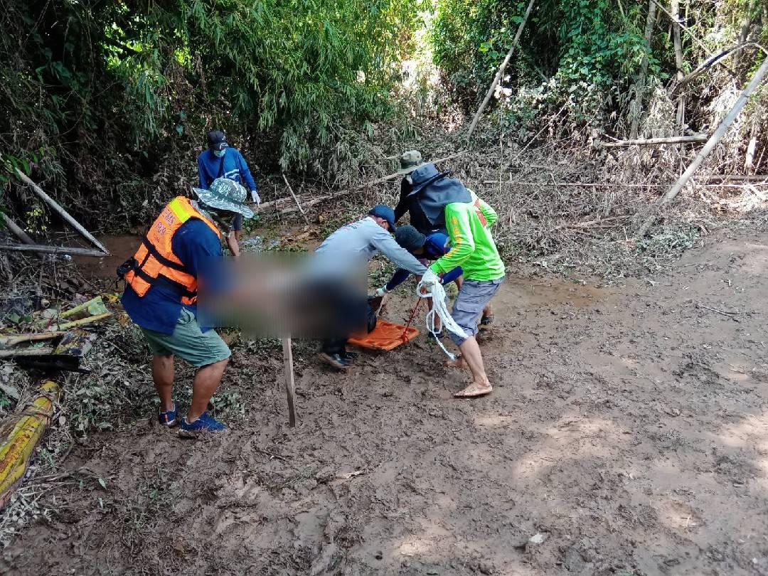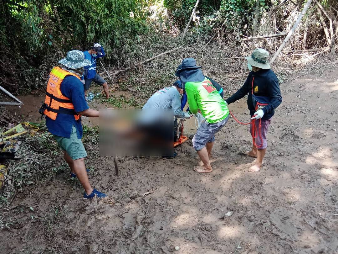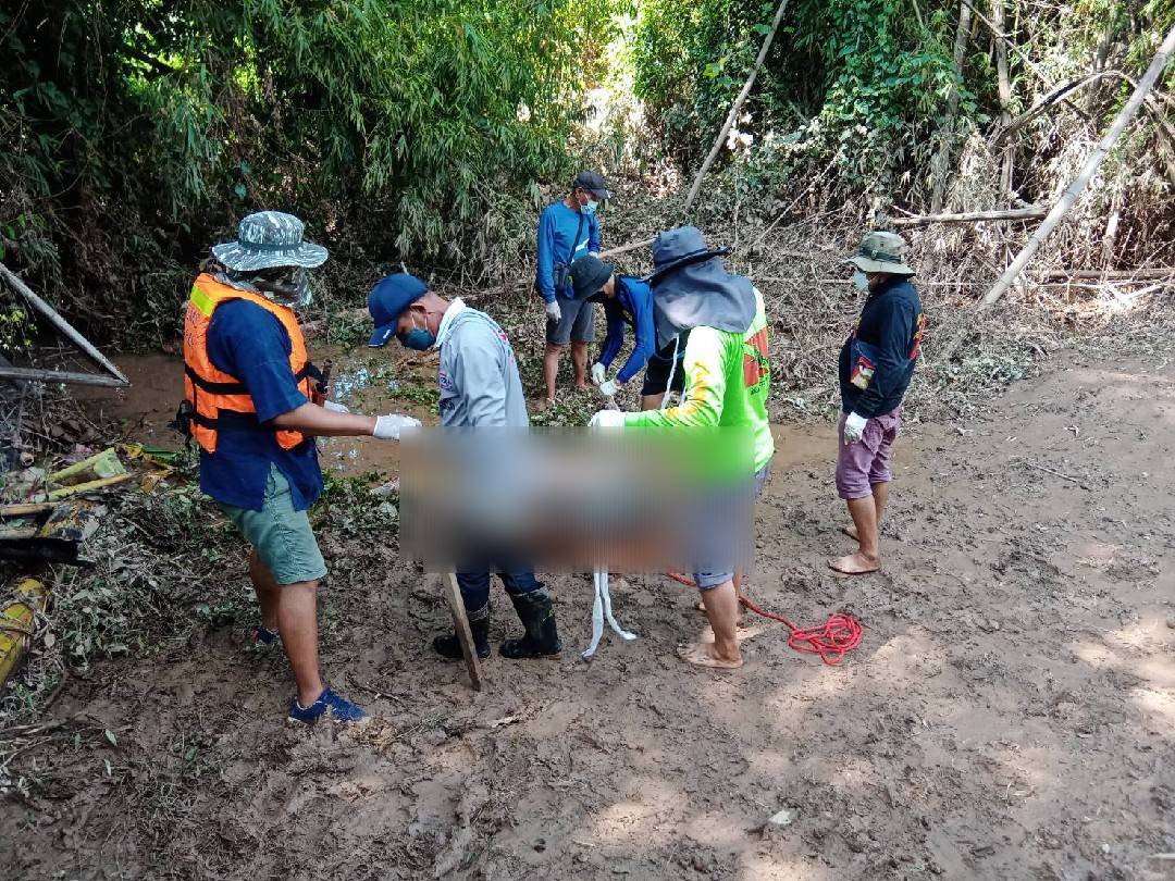 โดยสภาพศพนอนคว่ำหน้า สวมเสื้อสีน้ำเงิน กางเกงขาสั้น ร่างถูกกอไผ่รั้งไว้ โดยนายสุชาติ (สงวนนามสกุล) อายุ 61 ปี บิดาได้พยายามหาศพลูกชายจนมาพบโดยเปิดใบกล้วยที่ปิดศพออก พบว่าเป็นศพลูกชาย นอนอยู่