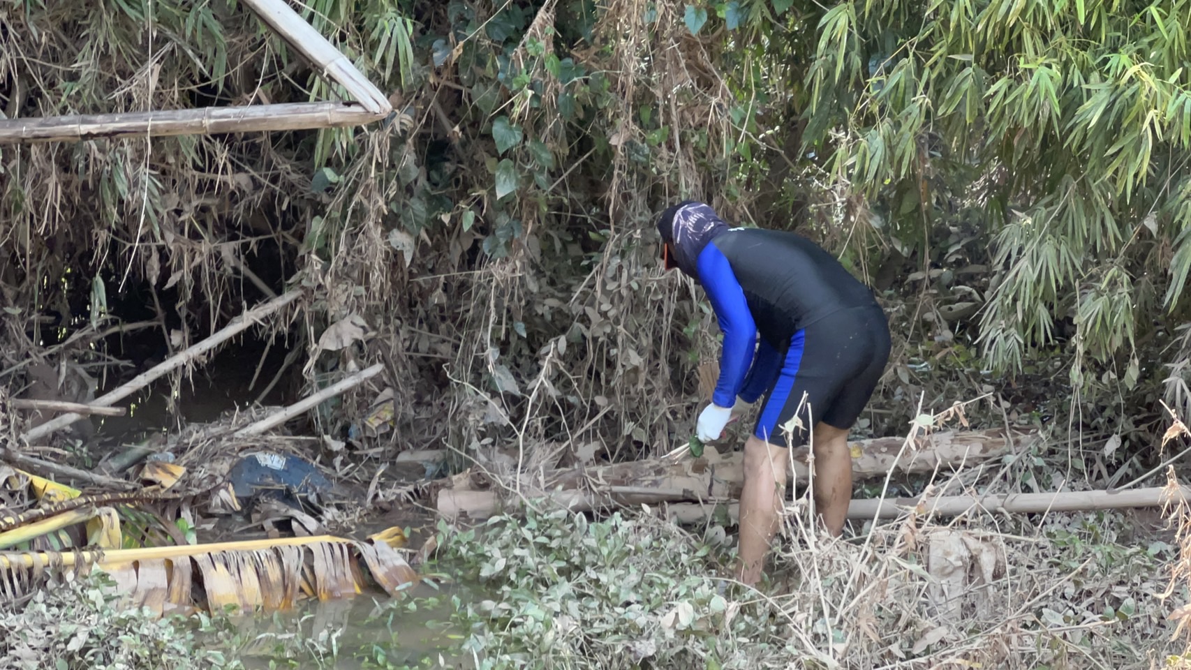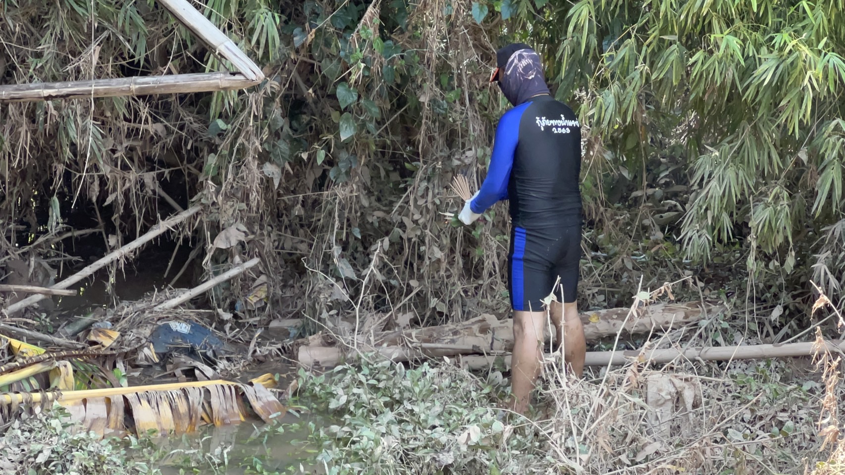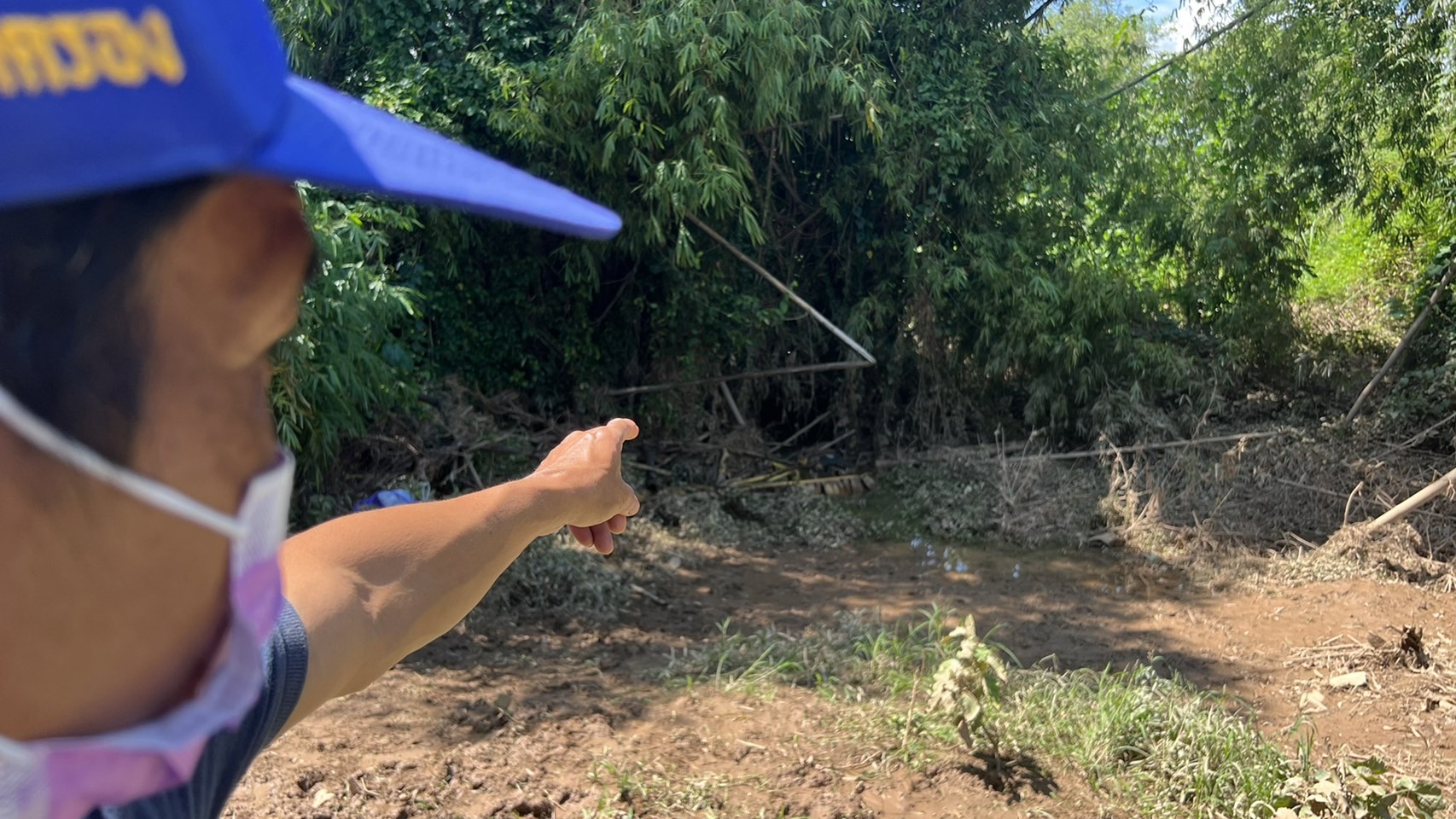 โดยสภาพศพนอนคว่ำหน้า สวมเสื้อสีน้ำเงิน กางเกงขาสั้น ร่างถูกกอไผ่รั้งไว้ โดยนายสุชาติ (สงวนนามสกุล) อายุ 61 ปี บิดาได้พยายามหาศพลูกชายจนมาพบโดยเปิดใบกล้วยที่ปิดศพออก พบว่าเป็นศพลูกชาย นอนอยู่