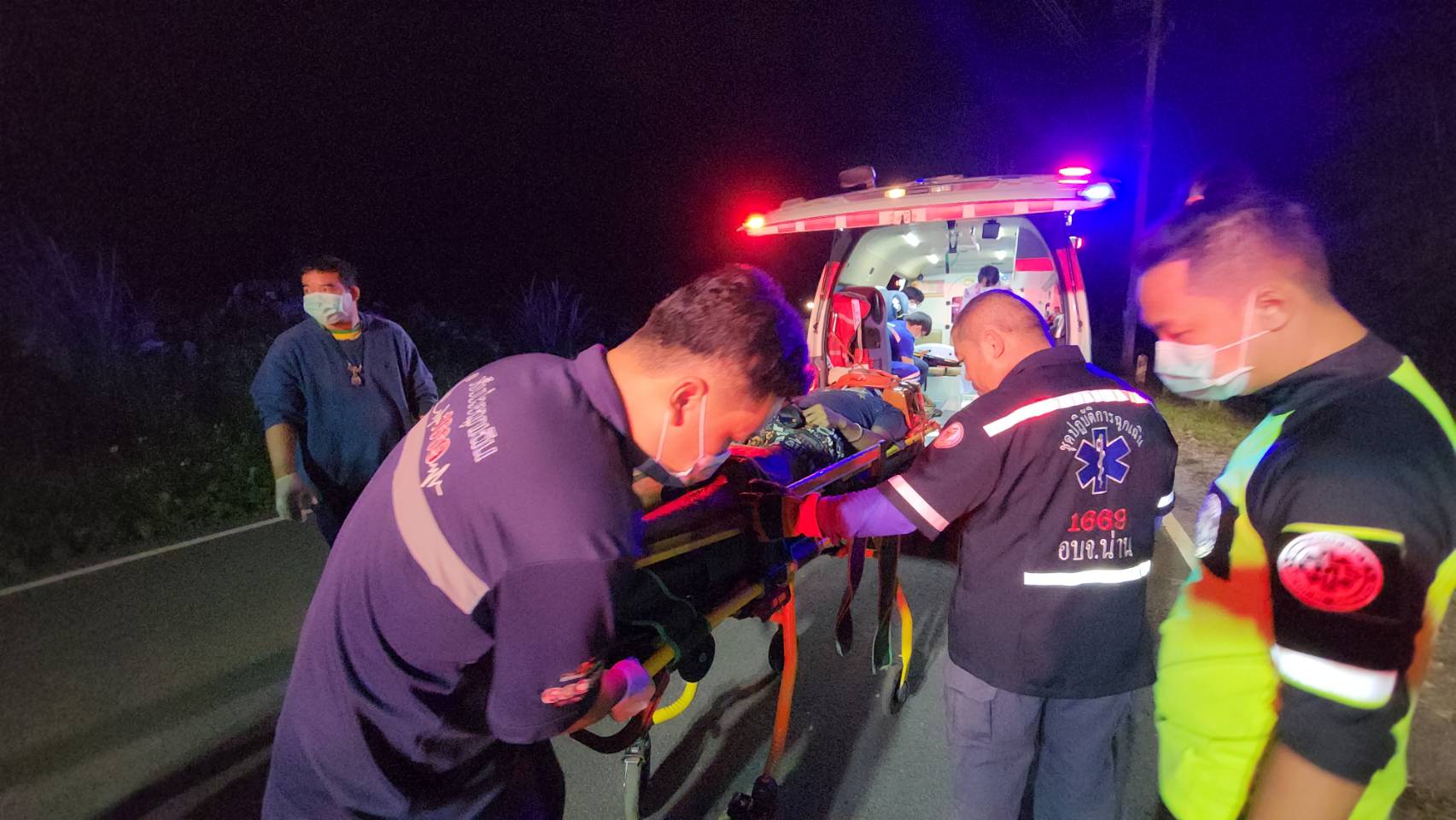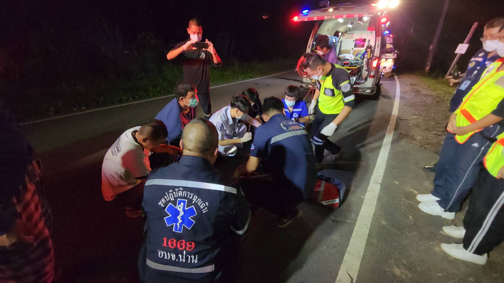 ในที่เกิดเหตุพบชุดปฏิบัติการ การแพทย์ฉุกเฉิน อบต.บ่อ เข้าให้การช่วยเหลือ พบผู้บาดเจ็บติดอยู่ในรถไม่สามารถนำออกมาได้ จึงขอสนับสนุนรถอุปกรณ์ตัดถ่าง อบจ.น่าน รถกู้ชีพน่าน สนับสนุนไฟส่องสว่าง ใช้เวลา ประมาณ 20 นาที สามารถนำผู้ติดภายในออกมาได้ และให้การช่วยเหลือเบื้องต้น ณ จุดเกิดเหตุ ก่อนที่รถกู้ชีพ อบต.บ่อ และรถกู้ชีพนครน่านโรงพยาบาลน่าน จะนำตัวผู้ได้รับบาดเจ็บส่งรักษาตัวที่โรงพยาบาลน่าน