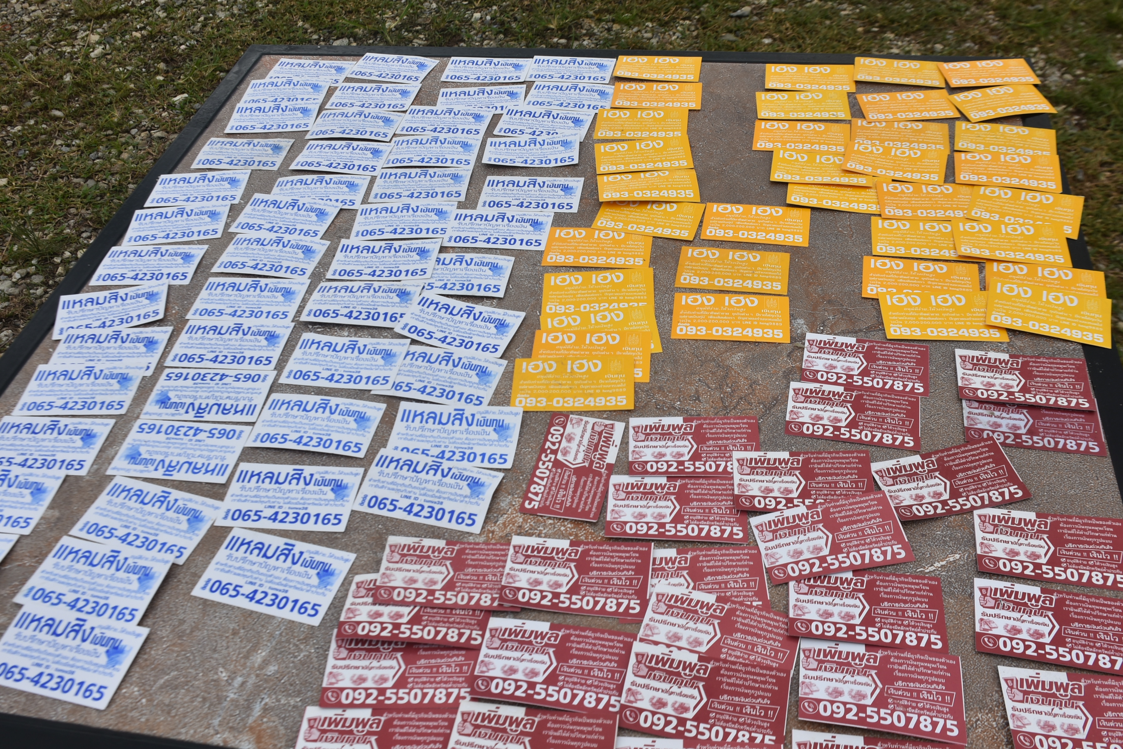 ผู้สื่อข่าวได้ลงพื้นที่ไปยังตลาดใหม่แม่กรณ์ พบว่าบรรดาพ่อค้าแม่ค้าได้เก็บรวบรวมนามบัตรในตลาดมาวางแยกบริษัท พบว่านามบัตรที่ถูกพบ มีบริษัทเงินกู้จำนวน 3 บริษัท จำนวนรวมหลายสิบใบ โดยนางไก่ (นามสมมุติ) แม่ค้าในตลาด ได้ให้ข้อมูลกับผู้สื่อข่าวว่า แก๊งค์เงินกู้จะว่าจ้างคนมาโปรยนามบัตรในเวลาหลังตลาดปิด ไม่ทราบช่วงเวลาแน่นอน โดยจะขับขี่มอเตอร์ไซค์มากันคันละ 2 คน คนหนึ่งจะทำหน้าที่ขับขี่ และคนซ้อนท้ายจะเป็นคนโปรยนามบัตร ตื่นเช้ามาก็จะพบนามบัตรตามจุดต่างๆทั่วไปหมด พ่อค้าแม่ค้าต้องช่วยกันเก็บกวาดทุกวัน และวันนี้ก็ได้ให้คนโทรไปบอกให้มาเก็บนามบัตรคืนไป แต่ทางนั้นกลับไม่พอใจ บอกจะเอาระเบิดมาโปรยแทน ทางกลุ่มพ่อค้าแม่ค้าในตลาดอยากวอนขอผู้มีอำนาจช่วยเหลือแก้ไขปัญหาดังกล่าวให้ด้วย เพราะได้รับความเดือดร้อนมานาน แจ้งทุกข์ไปที่ไหนก็เรื่องเงียบตลอด!