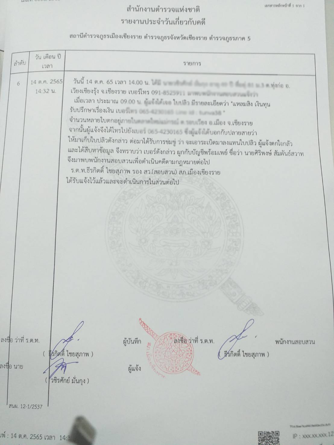 เวลา 14.32 น. วันที่ 14 ต.ค. 65 ขณะที่ ร.ต.ท.ธีรกิตต์ ไชยสุภาพ รอง สว.(สอบสวน) สภ.เมืองเชียงราย ปฏิบัติหน้าที่พรักงานสอบสวนเวร ได้มีนายวชิรศักย์ (สงวนนามสกุล) อายุ 49 ปี ชาวบ้าน ต.ทุ่งก่อ อ.เวียงเชียงรุ้ง จ.เชียงราย ได้เดินทางมาที่ สภ. เพื่อแจ้งความดำเนินคดีกับนายศิริพงษ์ (สงวนนามสกุล)