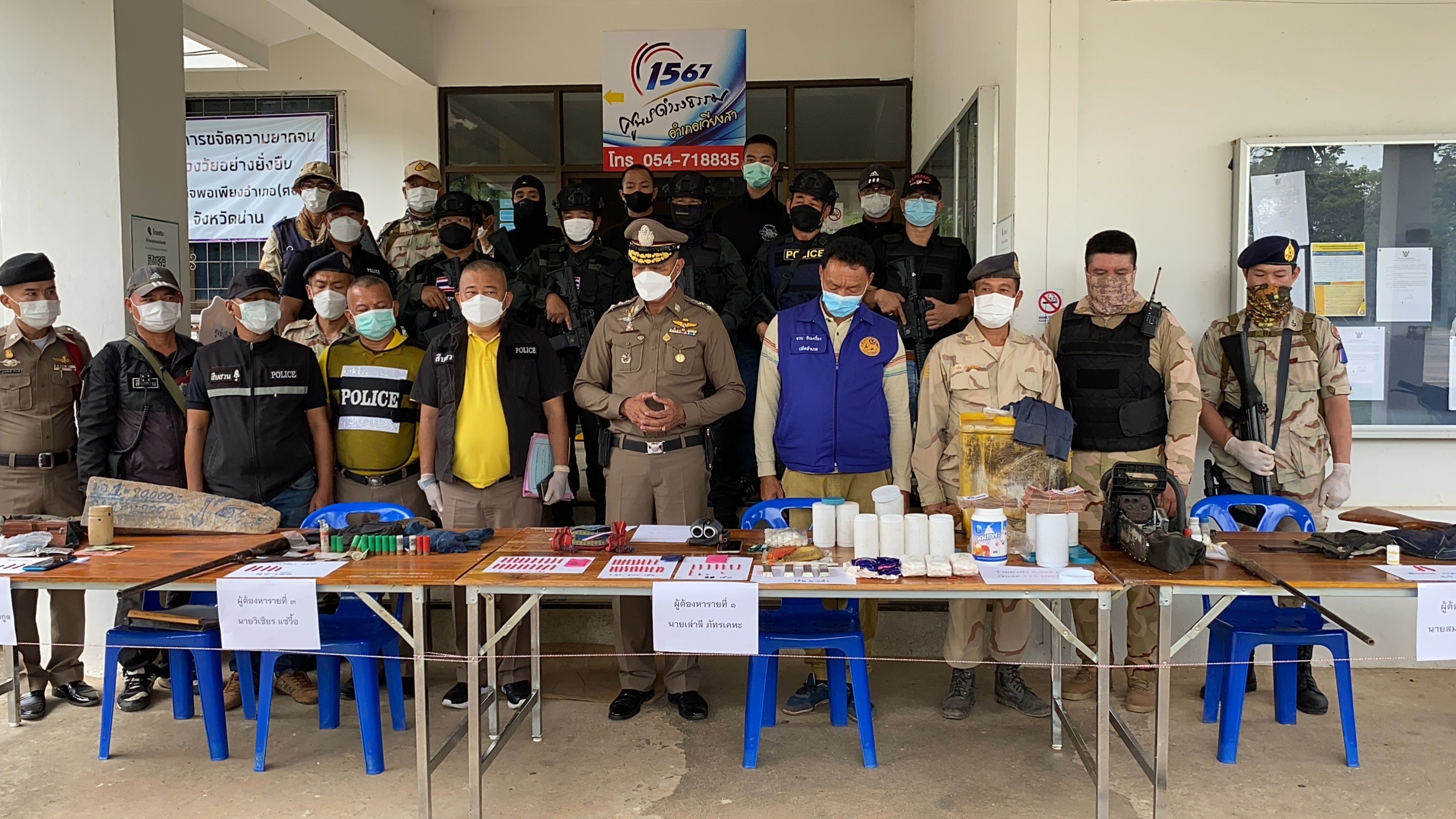 พล.ต.ต. ปิยะพันธ์ ภัทรพงศ์สินธุ์ ผบก.ภ.จ.น่าน พร้อมด้วย นายพิพัฒน์ เพ็ชร์พิพัฒน์ นอภ.เวียงสา ฝ่ายปกครอง อ.เวียงสา และสมาชิกอาสาสมัครรักษาดินแดน อ.เวียงสา ร่วมแถลงข่าว การเข้าจับกุมผู้ต้องหาเครือข่ายค้าเสพติด 5 ราย พร้อมของกลางยาบ้าและอาวุธปืน