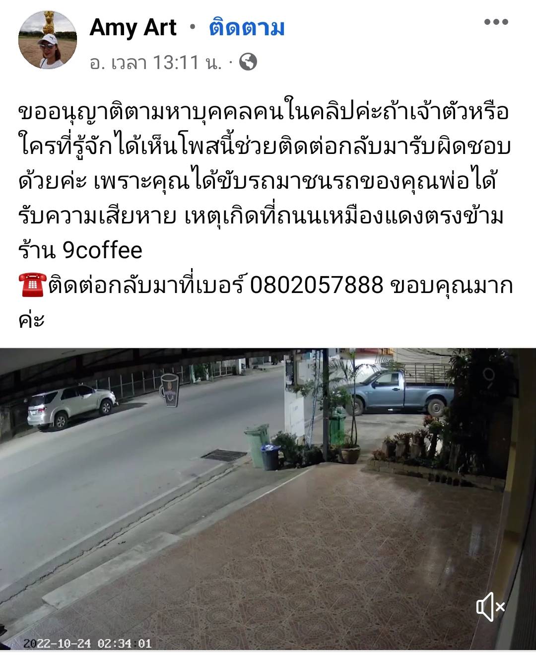 “ขออนุญาตตามหาบุคคลคนในคลิปค่ะ ถ้าเจ้าตัวหรือใครที่รู้จักได้เห็นโพสต์นี้ ช่วยติดต่อกลับมารับผิดชอบด้วยค่ะ เพราะคุณได้ขับรถมาชนรถของคุณพ่อได้รับความเสียหาย เหตุเกิดที่ถนนเหมืองแดงตรงข้ามร้าน 9coffee ☎️ติดต่อกลับมาที่เบอร์ 0802057888 ขอบคุณมากค่ะ”