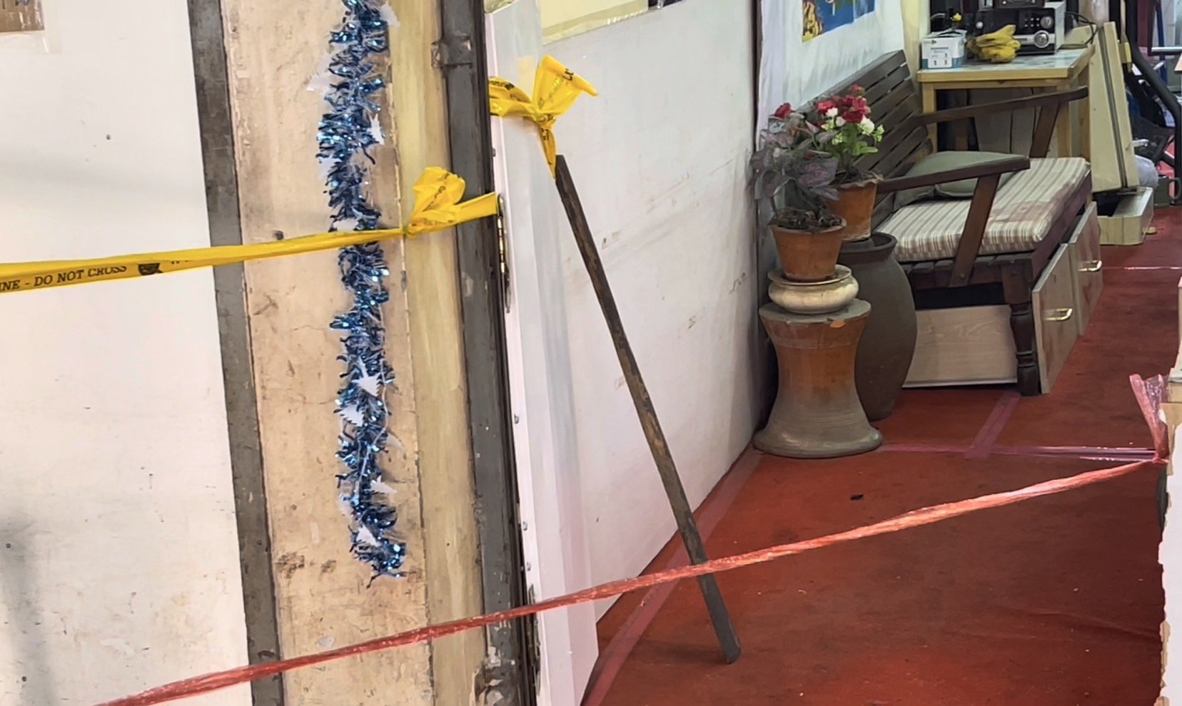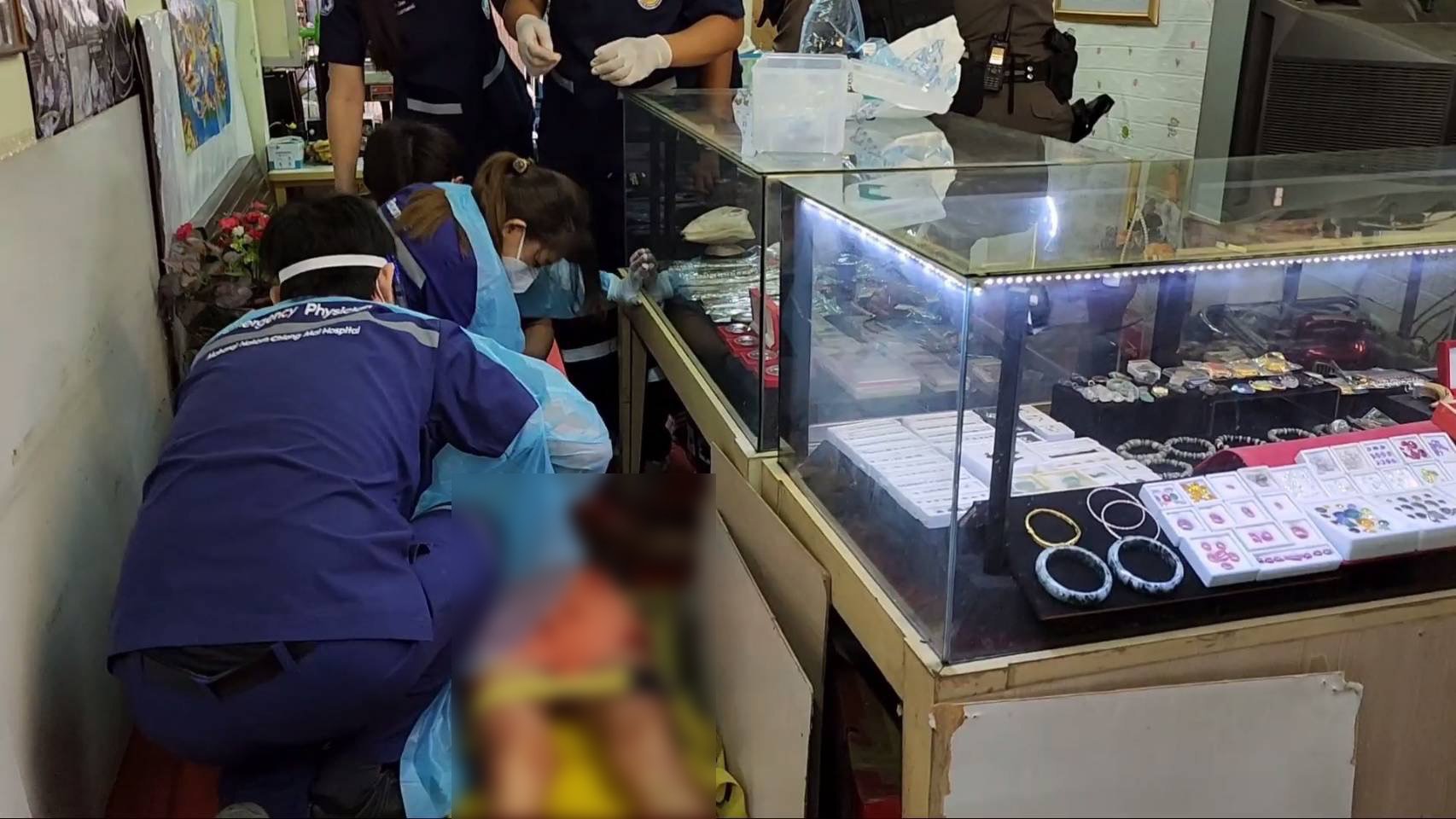 ซึ่งเมื่อมาถึงยังที่เกิดเหตุ เป็นห้องเช่าเปิดเป็นร้านทำกรอบพระ และรับทำเครื่องประดับ ภายในตลาดต้นพยอม โดยบริเณในร้านพบผู้บาดเจ็บสาหัสเป็นหญิง 1 ราย นอนกองกับพื้น มีบาดแผลฉกรรจ์ถูกแทงบริเวณหลัง 3 แผล และมีเลือดไหล ทางเจ้าหน้าที่กู้ภัยพร้อมกับทีมแพทย์ได้เร่งทำการช่วยเหลือปฐมพยาบาลและรีบนำตัวส่งโรงพยาบาลโดยด่วน นอกจากนี้ภายในห้องน้ำพบผู้บาดเจ็บอีก 1 รายเป็นชาย มีบาดแผลฉกรรจ์บริเวณลำคอ และพบมีดลักษณะเป็นมีดทำครัว 1 เล่มอยู่ใกล้กับร่างผู้บาดเจ็บ ทางเจ้าหน้าที่ได้ช่วยเหลือนำตัวส่งโรงพยาบาลโดยด่วนเช่นกัน และต่อมาทราบว่าทางฝ่ายหญิงที่ได้รับบาดเจ็บได้เสียชีวิตลงในที่สุด
