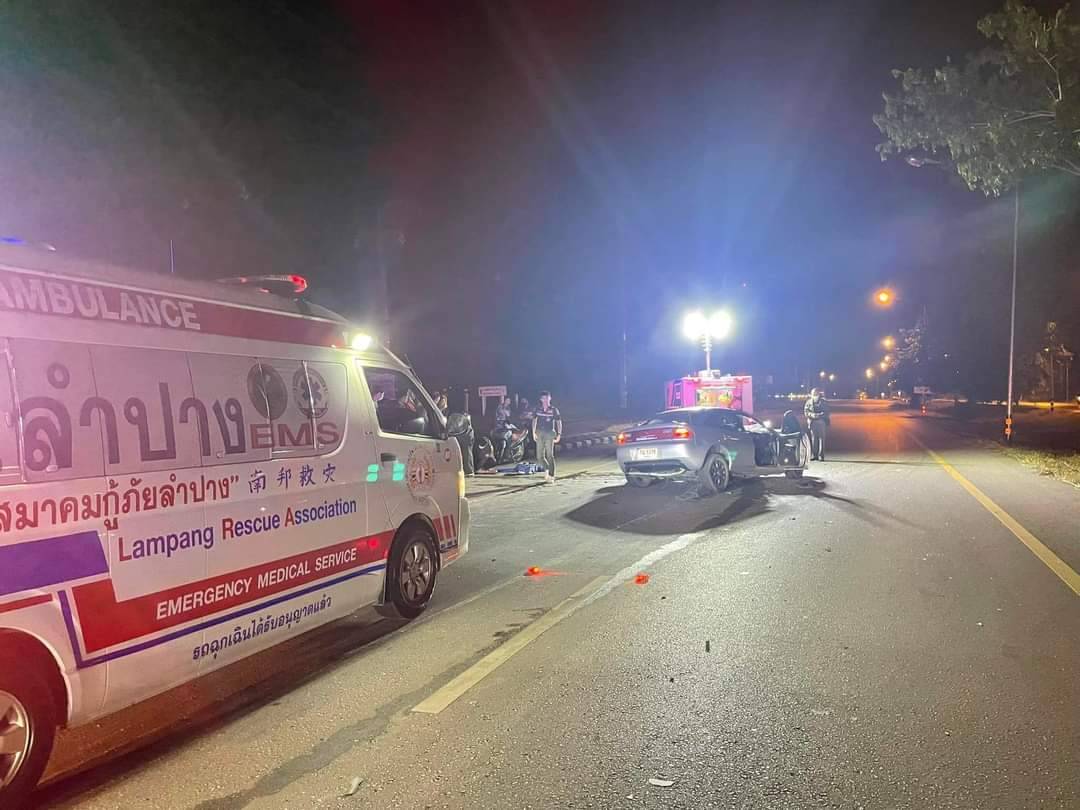 ในที่เกิดเหตุพบรถยนต์เก๋งสีบรอนซ์เงิน ทะเบียน กม xxxx เชียงใหม่ จอดขวางอยู่กลางถนน สภาพรถด้านหน้าฝั่งซ้ายยุบมาเกือบครึ่งคัน พบผู้บาดเจ็บรวม 3 ราย เป็นชายทั้งหมด อายุประมาณ 25-35 ปี โดยได้กระเด็นออกมานอกรถ 1 คน เป็นคนขับ ส่วนอีกคนติดอยู่บริเวณที่นั่งข้างคนขับ และเบาะหลังอีก 1 คน จึงใช้เครื่องตัดถ่างงัดรถนำร่างออกมาได้ ซึ่งได้รับบาดเจ็บสาหัสทั้งหมด ได้นำตัวผู้บาดเจ็บส่ง รพ.ลำปางอย่างเร่งด่วน