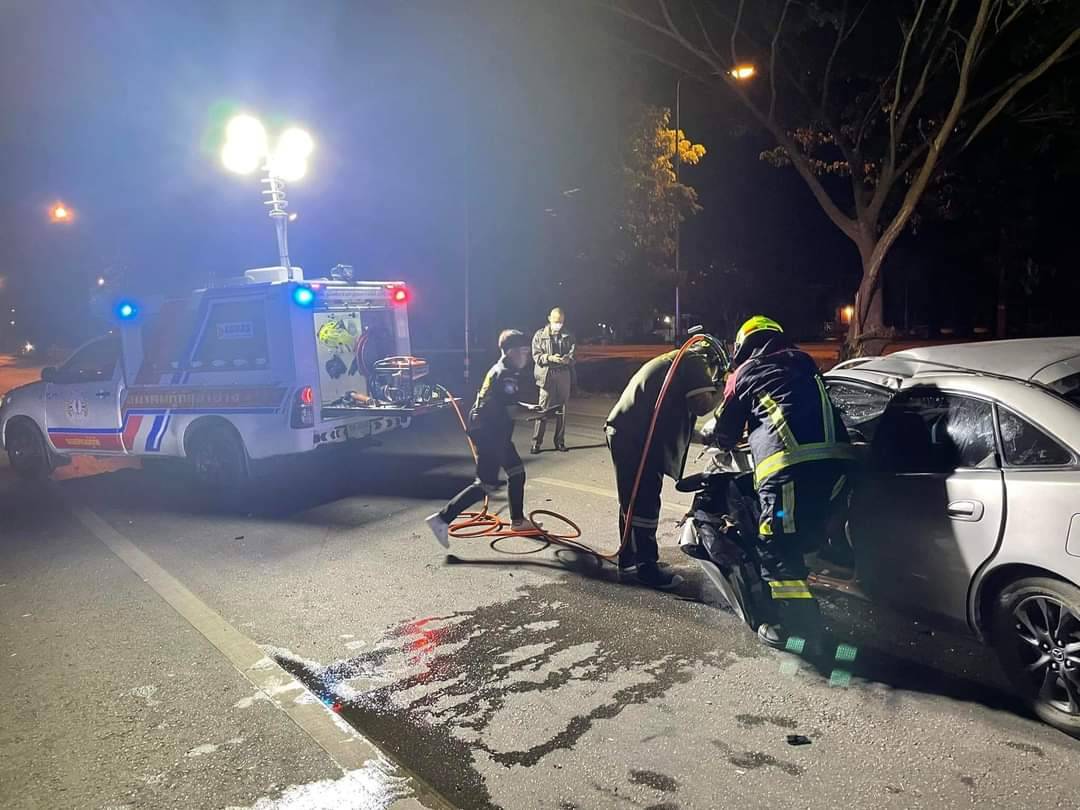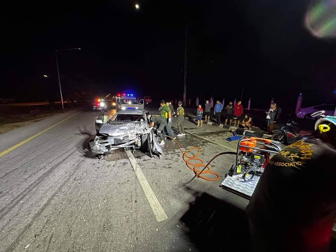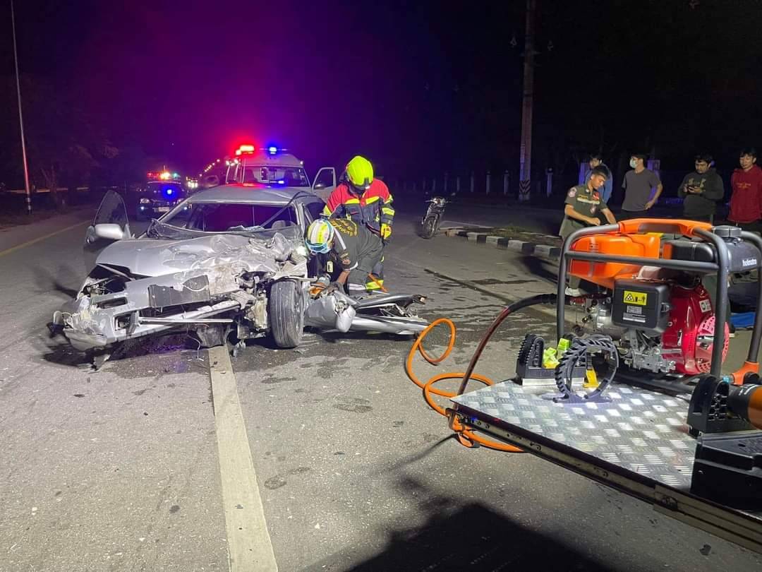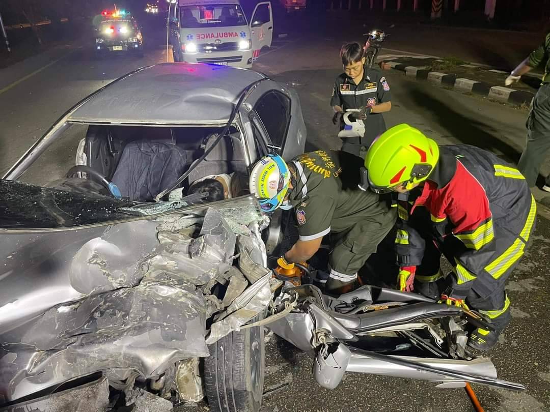 เก๋งชนท้ายรถไม่ทราบชนิดพังยับ หนุ่มเจ็บสาหัส 3 ราย ติดในรถ กู้ภัยเร่งช่วยชีวิต
