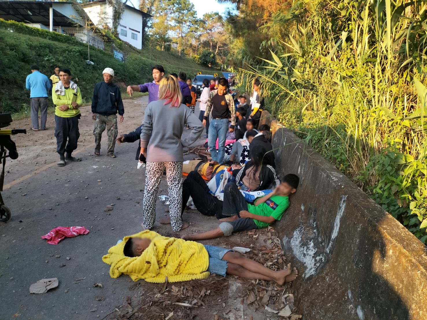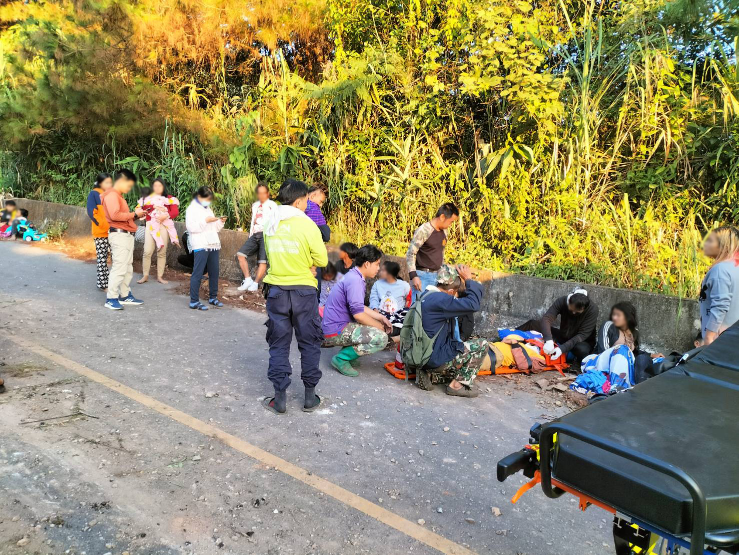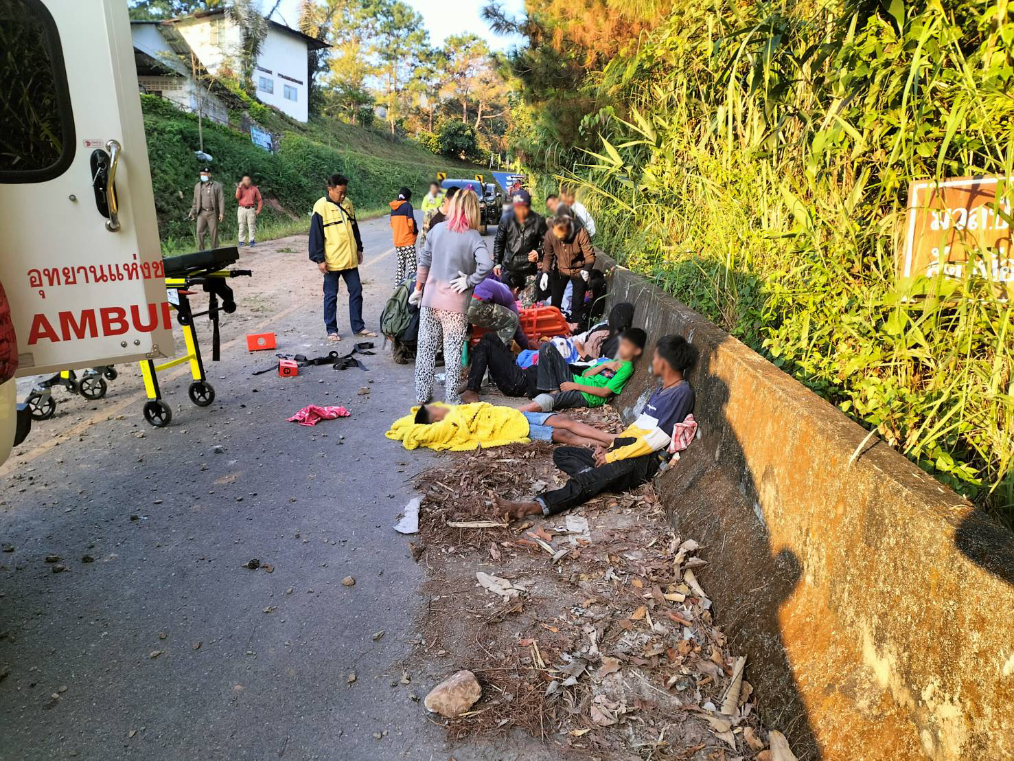 เสียหลักอยู่ในร่องน้ำข้างทางขาลงเขามุ่งหน้า อ.นาน้อย มีผู้ได้รับบาดเจ็บทั้งหมด 20 คน เป็นชาย 11 คน ผู้หญิง 9 คน บาดเจ็บสาหัส 2 คน ชาย 1 หญิง 1 คน โดยมีเจ้าหน้าที่ทีมกู้ชีพกู้ภัย อปท.ในพื้นที่ และหน่วยงานข้างเคียงให้การช่วยเหลือ นำส่งโรงพยาบาลนาน้อย และหมวดทางหลวงนาน้อย อำนวยความสะดวกด้านการจราจร ทำความสะอาดบริเวณที่เกิดเหตุ