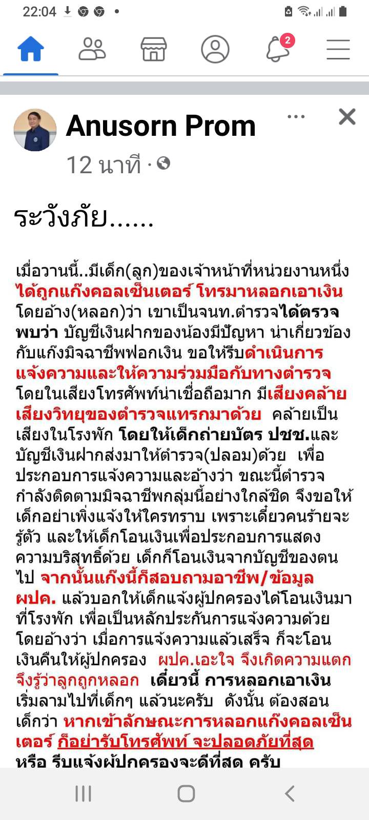 “ระวังภัย เมื่อวานนี้..มีเด็ก (ลูก) ของเจ้าหน้าที่หน่วยงานหนึ่งได้ถูกแก๊งคอลเซ็นเตอร์ โทรมาหลอกเอาเงินโดยอ้าง (หลอก) ว่า เขาเป็น จนท.ตำรวจได้ตรวจพบว่า บัญชีเงินฝากของน้องมีปัญหา น่าเกี่ยวข้องกับแก๊งมิจฉาชีพฟอกเงิน ขอให้รีบดำเนินการ แจ้งความและให้ความร่วมมือกับทางตำรวจ