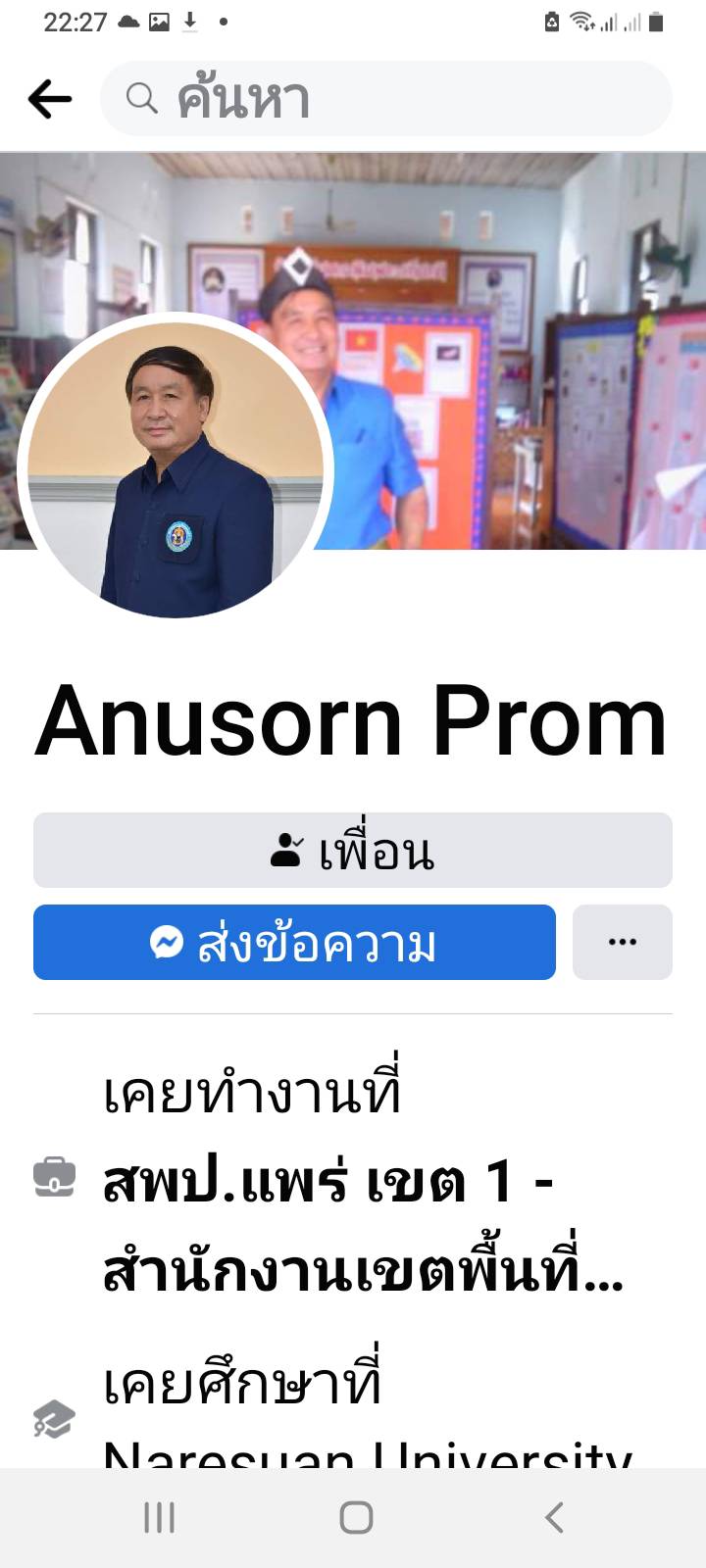 ผู้สื่อข่าวรายงานจาก จ.แพร่ เมื่อคืนวันที่ 14 พฤศจิกายน 2565เวลา 22.04 น. ผู้ใช้เฟชบุ๊ค ชื่อ Anusorn Prom เป็นเฟซบุ๊กของ นายอนุสรณ์ พรมรังกา ผอ.รร.รัฐราษฏร์บำรุง ต.ทุ่งกวาว อ.เมือง จ.แพร่ สังกัด สพป