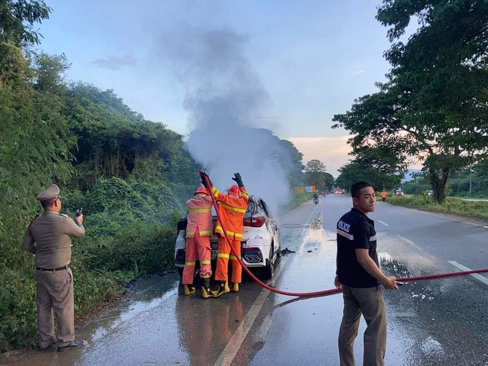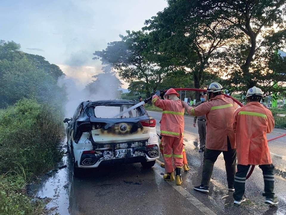 ตรวจสอบพบรถบนต์เก๋งยี่ห้อเอ็มจี สีขาว หมายเลขทะเบียน 1 ขห 689 กรุงเทพมหานคร จอดอยู่ริมถนน เกิดไฟลุกไหม้บริเวณห้องเครื่องอย่างรุนแรง และลุกลามไปยังตัวรถ เจ้าหน้าที่รถดับเพลิงเทศบาลสบปราบ อบต.แม่กัวะ ตร.สบปราบ กู้ภัยลำปางจุดสบปราบ ร่วมกับดับเพลิงที่ลุกไหม้ จนควบคุมเพลิงไว้ได้