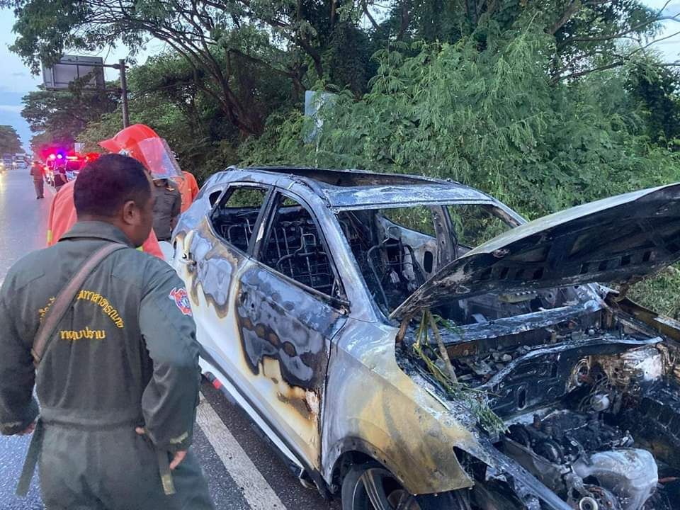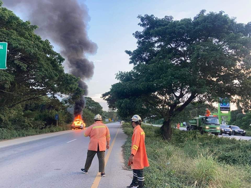 เก๋งแวะเติมน้ำมัน ออกปั๊มได้แค่ 1 กม.เกิดควันพุ่งออกห้องเครื่อง ไฟลุกไหม้ลามทั้งคัน