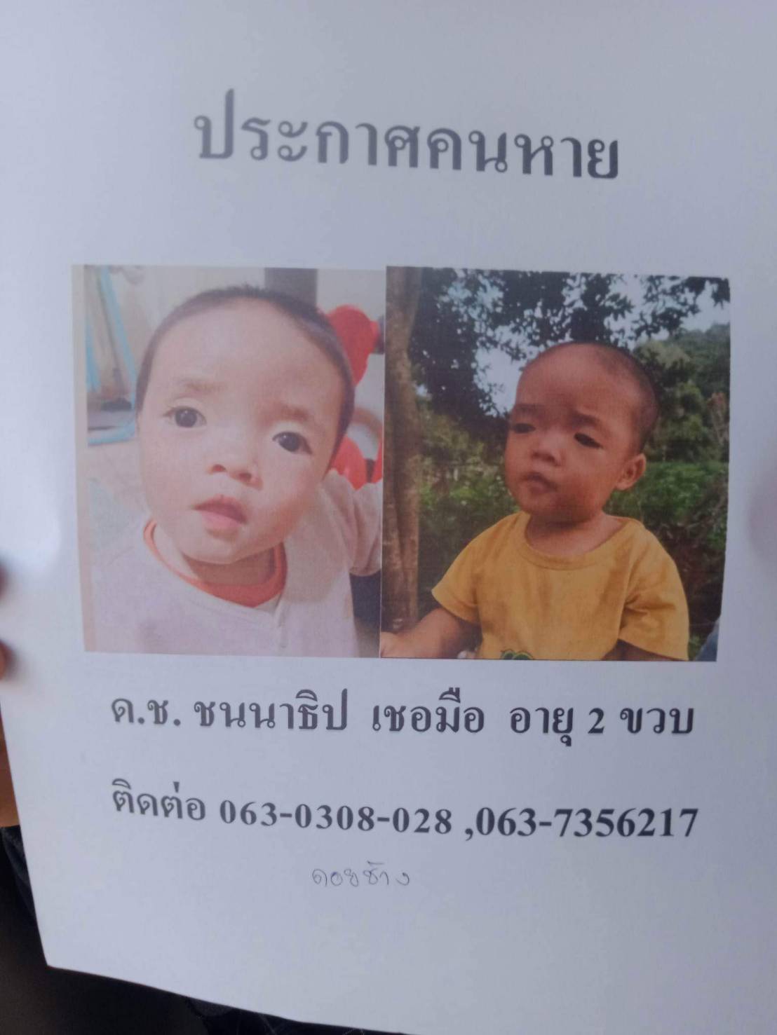 จากการสอบถาม เด็กที่หายออกจากบ้านคือ ด.ช.ชนาธิป เชอมือ อายุ 2 ขวบ 2 เดือน เป็นบุตรชายของนายอาเสาะ เชอมือ อายุ 37 ปี และ น.ส.บูเชอ เฌอหมื่อ อายุ 26 ปี ได้พักอาศัยอยู่บ้านเลขที่ 348 หมู่ 4 ต.วาวี อ.แม่สรวย จ.เชียงราย ได้หายไปจากที่บ้านโดยพ่อและแม่ได้เดินทางไปเก็บกาแฟที่ไร่กาแฟ ซึ่งอยู่ห่างไกลจากบ้าน จึงได้ฝากลูกชายรวม 3 คน ไว้กับนางหมี่ซุ้ม เชอหมื่อ อายุ 62 ปี ช่วยดูแล ส่วน ด.ช.ชนาธิปฯ (ลูกคนสุดท้อง) เป็นเด็กพิเศษ ยังไม่ได้ไปโรงเรียน