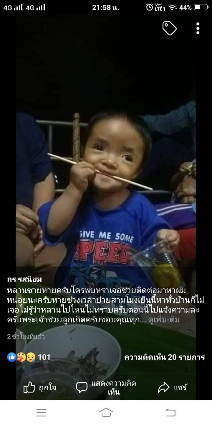 วันที่ 29 พ.ย. 65 ผู้สื่อข่าวรายงานว่า เมื่อวานนี้วันที่ 29 พ.ย. 65 เวลาประมาณ 15.30 น.เกิดเหตุเด็กหายตัวออกจากบ้าน ญาติและเพื่อนบ้านระดมกำลังตามหาข้ามวัน ยังไม่พบตัวเด็ก หวั่นถูกลักพาตัว วอนสื่อช่วยกระจายข่าว