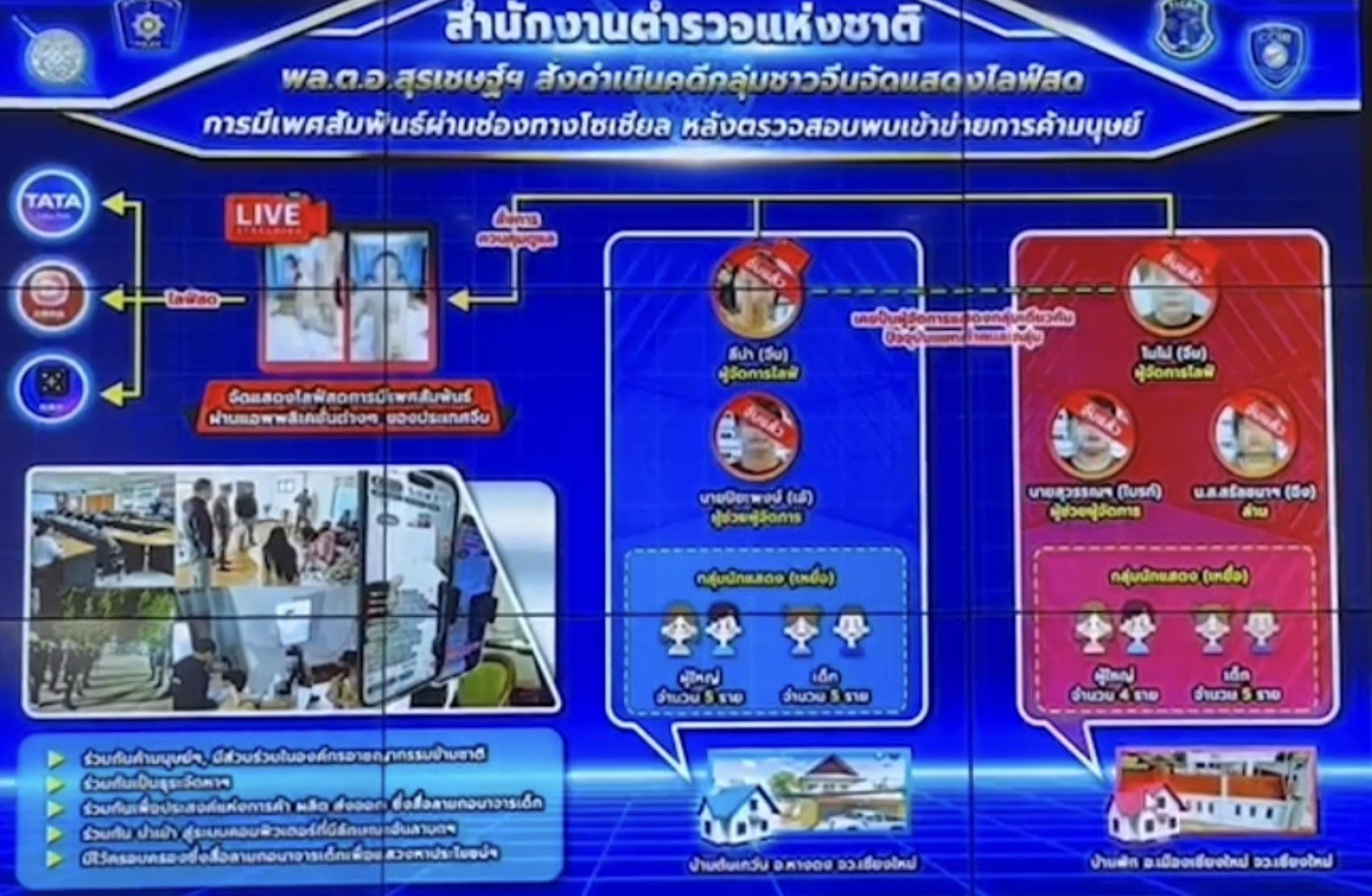 ส่วนอีกจุดหนึ่ง บ้านหมู่ 4 ต.ป่าแดด อ.เมือง จ.เชียงใหม่ จากการเข้าตรวจค้น พบ ผู้ต้องหาจำนวน 3 คน คือ นางซิง หรือโมโม่ สัญชาติจีน เป็นหัวหน้าแก๊ง ทำหน้าที่คอยจัดการการถ่ายทอดสด จ่ายเงินให้นักแสดง และพากย์เสียงภาษาจีน นายสุวรรณ หรือไบรท์ เป็นผู้ช่วย และ น.ส.สรัลชนา หรือฉิง เป็นล่าม ตรวจพบนักแสดง จำนวน 9 ราย โดยพบว่าเป็นเยาวชนอายุต่ำกว่า18 ปี ซึ่งเป็นเหยื่อจากการค้ามนุษย์ จำนวน 5 ราย ซึ่งผู้ต้องหาถูกดำเนินคดีในข้อหา “ร่วมกันเพื่อความประสงค์แห่งการค้า หรือโดยการค้า หรือยังให้ส่งออกไปนอกราชอาณาจักร หรือทำให้แพร่หลายโดยประการใดๆ ซึ่งสื่อลามกอนาจารเด็ก, ร่วมกันนำเข้าสู่ระบบคอมพิวเตอร์ซึ่งข้อมูลคอมพิวเตอร์ใดๆ ที่มีลักษณะอันลามกและข้อมูลคอมพิวเตอร์นั้นประชาชนทั่วไปอาจเข้าถึงได้, ร่วมกันกระทำความผิดฐานค้ามนุษย์ โดยเป็นธุระจัดหา จัดให้อยู่อาศัย หรือรับไว้ซึ่งเด็ก เพื่อผลิตหรือเผยแพร่สื่อลามก”