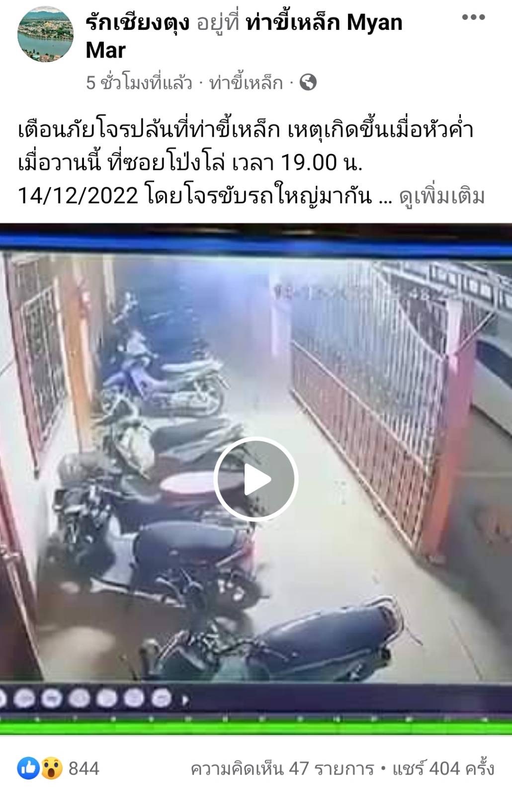 “เตือนภัยโจรปล้นที่ท่าขี้เหล็ก เหตุเกิดขึ้นเมื่อหัวค่ำเมื่อวานนี้ ที่ซอยโป่งโล่ เวลา 19.00 น. 14/12/2022 โดยโจรขับรถใหญ่มากัน 4 คน มีปืนด้วย โดยผู้เสียหายกำลังจะเดินเข้าห้อง แล้วโจรก็รุมปล้นถึงห้อง มาปล้นเอาของมีค่าไป มีทอง 2 บาท โทรศัพท์ไอโฟน14โปรแม็ก เงินสด 3 พันบาท บัตรประชาชนใบขับขี่เอาไปหมดเลย เห็นผู้เสียหายบอกด้วยว่า เหมือนโจรมันอยากจับตัวไปเรียกค่าไถ่มากกว่า ตอนแรกไม่สนใจเงินทองเลย เห็นมาเก็บเอาเงินทองที่ตกอยู่ทีหลัง มาเตือนภัย ให้คนที่ทำงานอยู่ท่าขี้เหล็กระวังกันด้วยครับ”