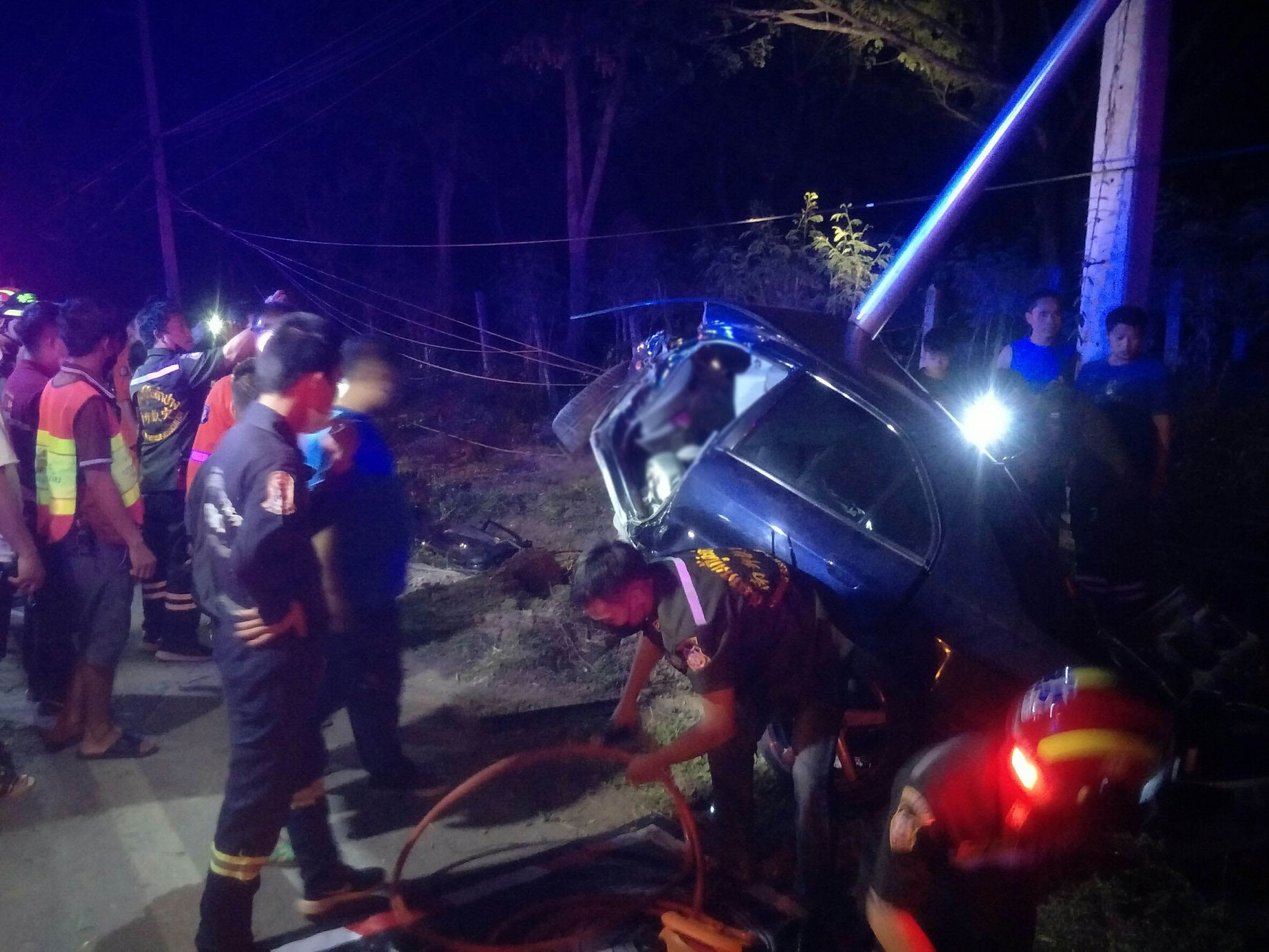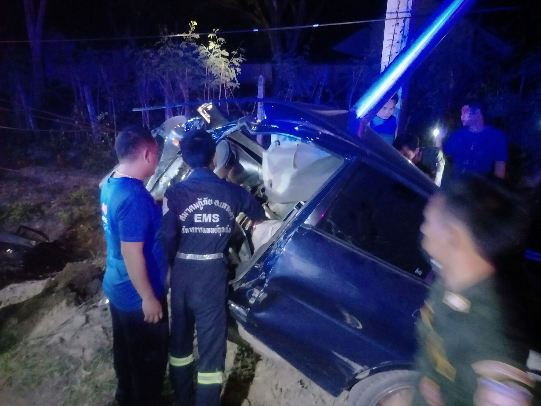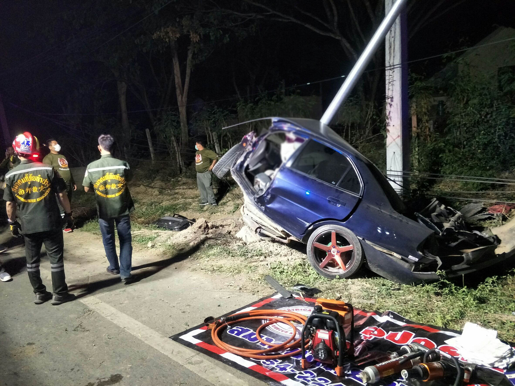 เก๋งเสียหลักแหกโค้งพลิกไถลพุ่งชนอัดเสาไฟกิ่ง รถพับครึ่งคันอัดร่างเสียชีวิต รายแรกของจังหวัดลำปาง ในห้วง 7 วันอันตราย