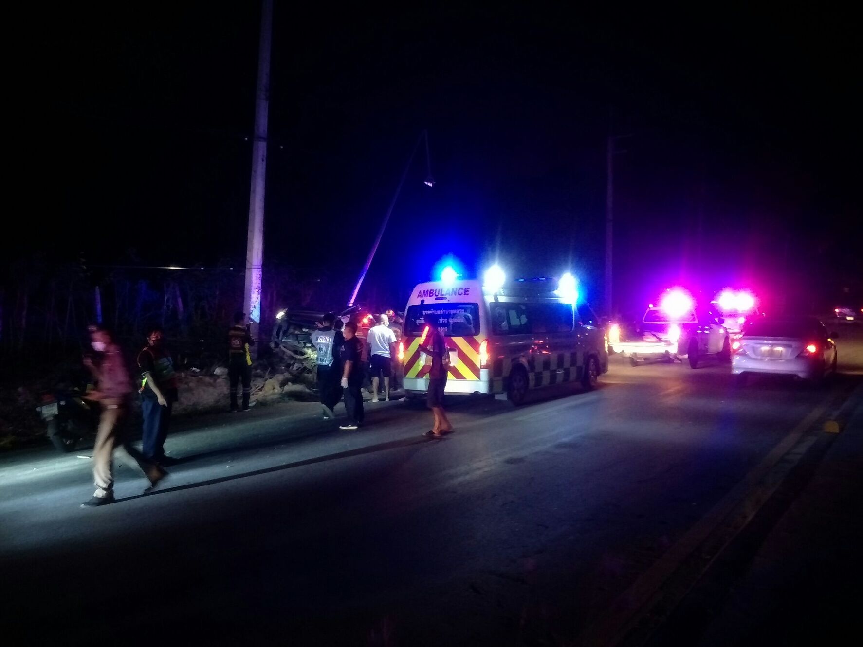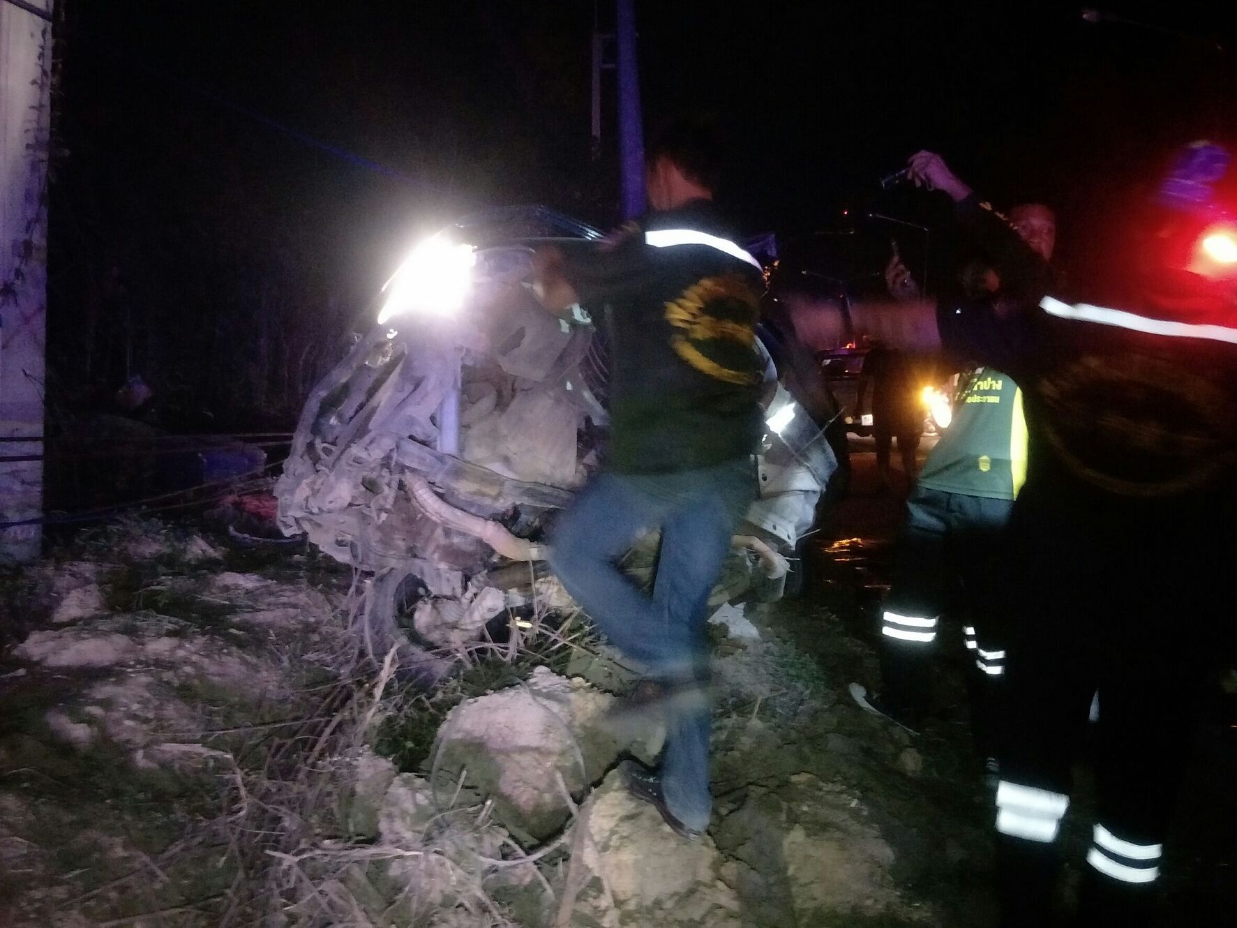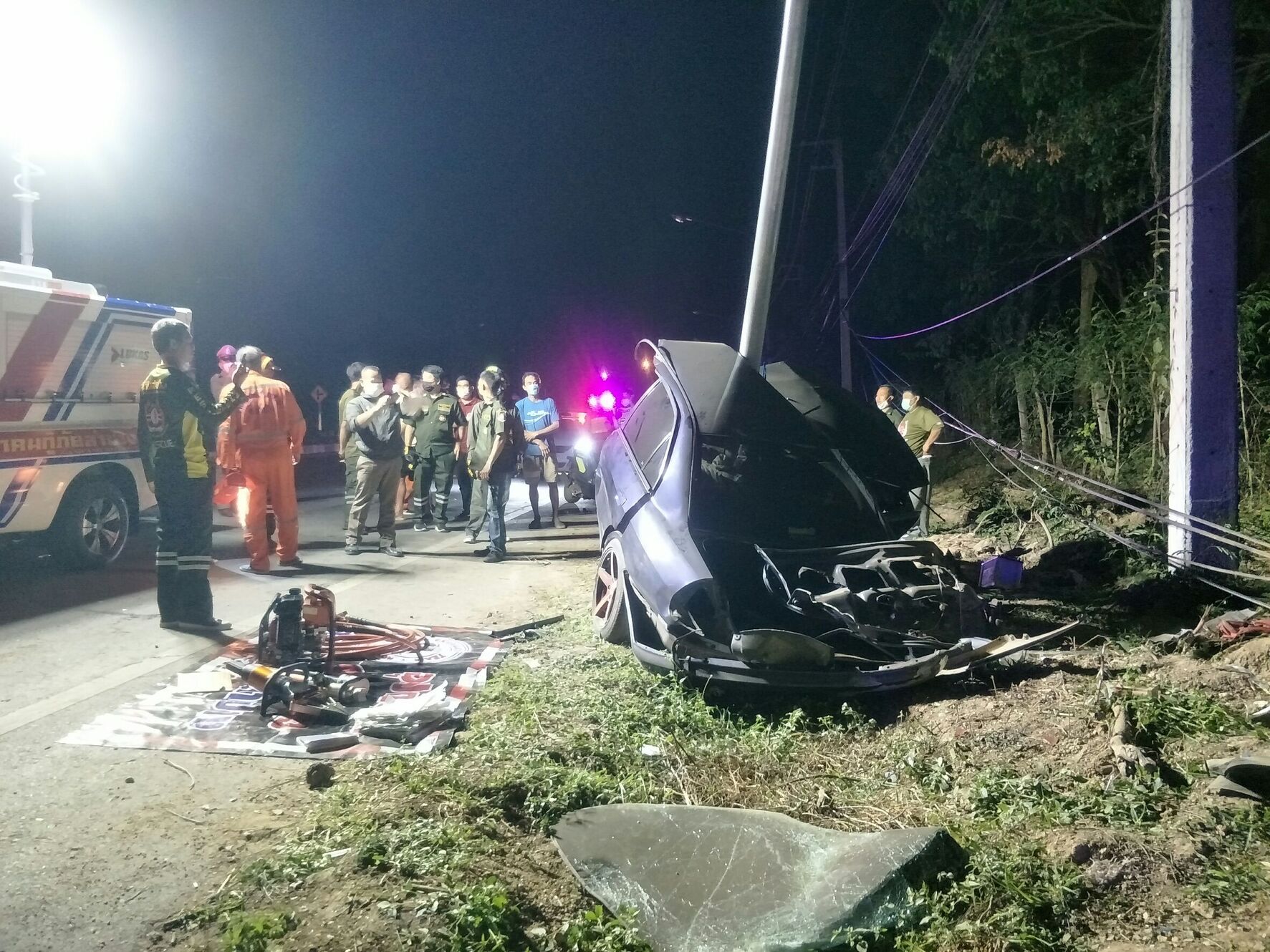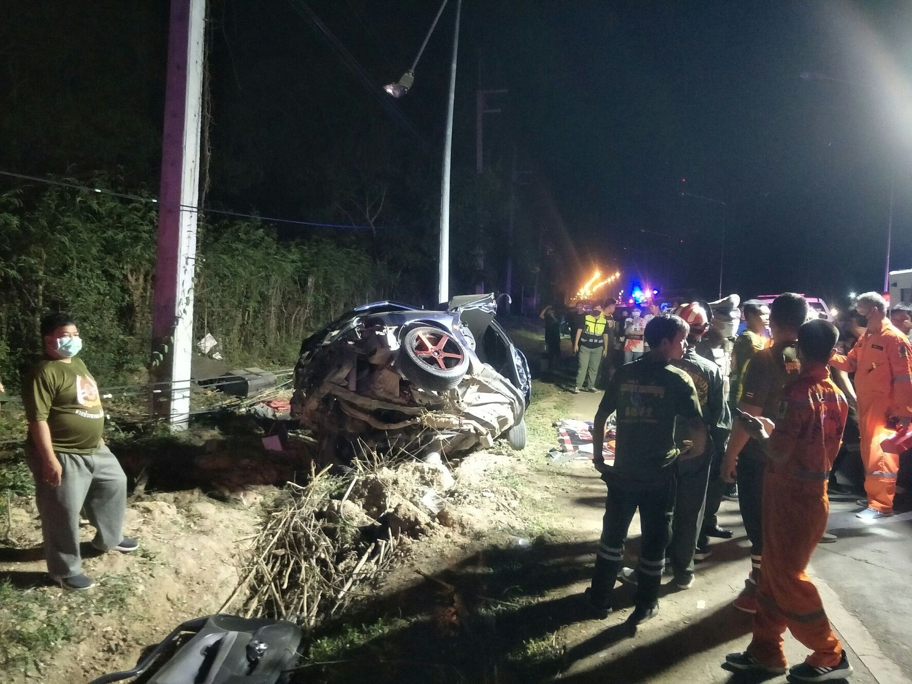 เก๋งเสียหลักแหกโค้งพลิกไถลพุ่งชนอัดเสาไฟกิ่ง รถพับครึ่งคันอัดร่างเสียชีวิต รายแรกของจังหวัดลำปาง ในห้วง 7 วันอันตราย