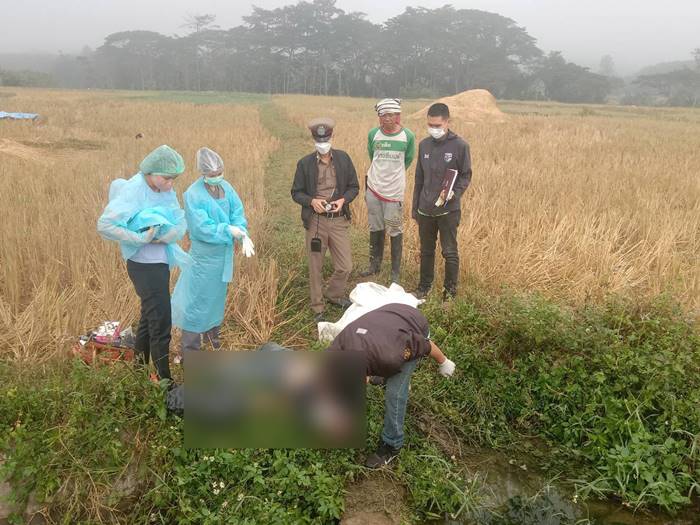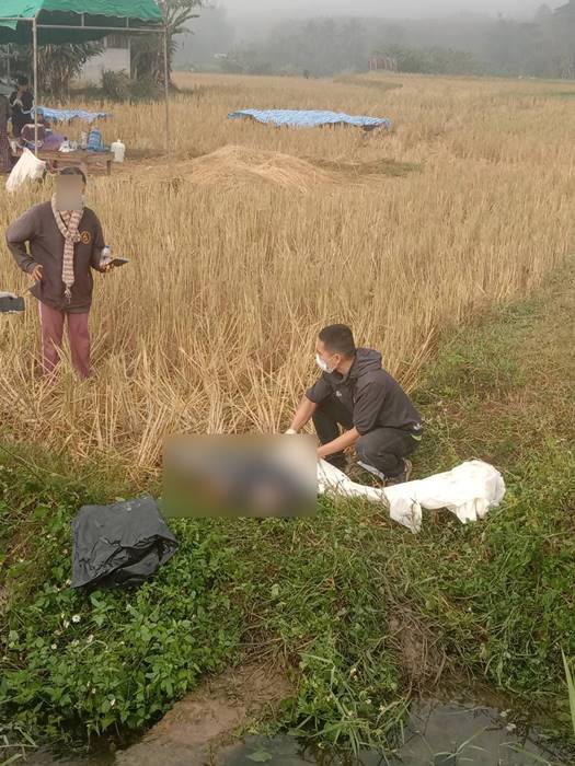 ในเบื้องต้นสันธิษฐานว่า สาเหตุ คาดว่าผู้ตายหกล้มแล้วตกลงในร่องน้ำลำน้ำเหมือง จนเสียชีวิตเนื่องจากขาดอากาศหายใจ ซึ่งตรงกับพยานที่มาพบศพในที่เกิดเหตุโดยก่อนเกิดเหตุผู้เสียชีวิตได้ไปร่วมงานขึ้นบ้านใหม่ใกล้จุดเกิดเหตุตั้งแต่เมื่อวานนี้ และช่วงเวลาประมาณ 20.30 น. ยังเห็น ผู้เสียชีวิตอยู่ในงานขึ้นบ้านใหม่ร่วมกันดื่มสุรารังสรรค์ กันอยู่และจากนั้นได้แยกย้ายกันกลับบ้าน กระทั่งรุ่งเช้ามาพบศพผู้เสียชีวิตดังกล่าว จึงได้แจ้งโทรศัพท์ 191 และ 1669 จนเจ้าหน้าที่มาตรวจพิสูจน์ในที่เกิดเหตุหลังจากชันสูตรพลิกศพแล้ว