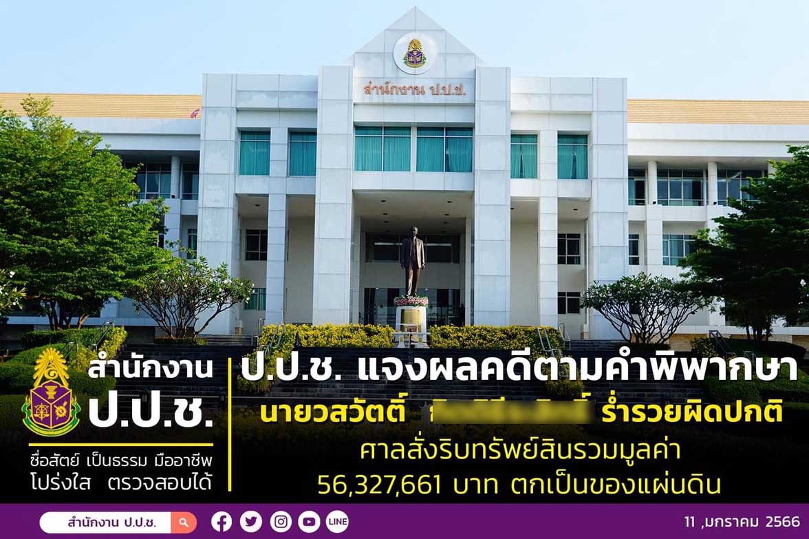 ป.ป.ช. แจงผลคดีตามคำพิพากษากรณี นายวสวัตติ์ กิตติธีระสิทธิ์ เมื่อครั้งดำรงตำแหน่งผู้อำนวยการส่วนบูรณะพัฒนาวัดและการศาสนสงเคราะห์ สำนักงานพระพุทธศาสนาแห่งชาติ ร่ำรวยผิดปกติ ศาลสั่งริบทรัพย์สินรวมมูลค่า 56,327,661 บาท ตกเป็นของแผ่นดิน
