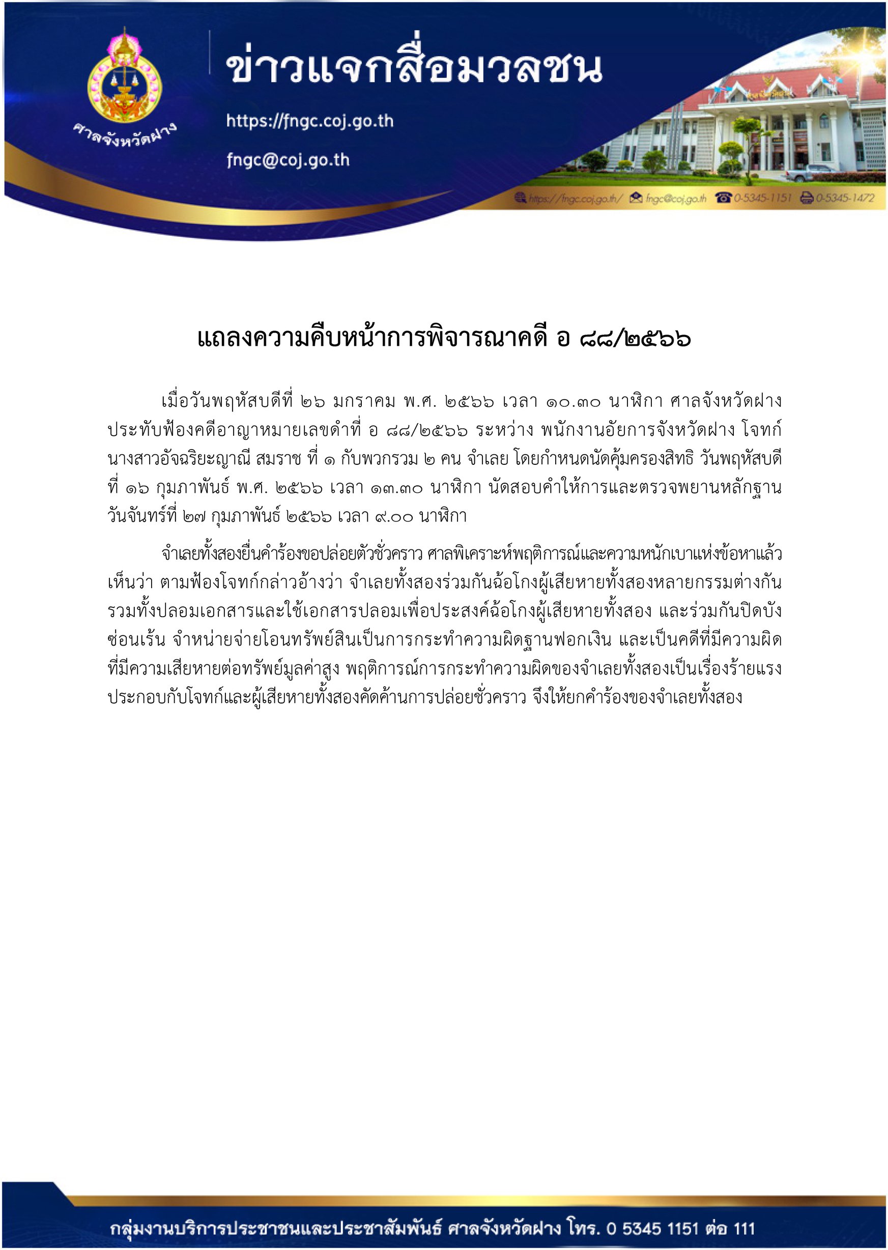 ด้านศาลจังหวัดฝาง ได้ออกหนังสือแถลงความคืบหน้าการพิจารณาคดี อ 88/2566 ตามเนื้อหาว่า เมื่อวันพฤหัสบดีที่ 26 มกราคม พ.ศ. 2566 เวลา 10.30 น. ศาลจังหวัดฝางประทับฟ้องคดีอาญาหมายเลขดำที่ อ 88/2566 ระหว่าง พนักงานอัยการจังหวัดฝาง โจทก์ นางสาวอัจฉริยะญาณี สมราช ที่ 1 กับพวกรวม 2 คน จำเลย โดยกำหนดนัดคุ้มครองสิทธิ วันพฤหัสบดีที่ 16 กุมภาพันธ์ พ.ศ. 2566 เวลา 13.30 น. นัดสอบคำให้การและตรวจสอบพยานหลักฐาน วันจันทร์ที่ 27 กุมภาพันธ์ 2566 เวลา 09.00 น. จำเลยทั้งสองยื่นคำร้องขอปล่อยตัวชั่วคราว ศาลพิเคราะห์พฤติการณ์และความหนักเบาแห่งข้อหาแล้วเห็นว่า ตามฟ้องโจทก์กล่าวอ้างว่า จำเลยทั้งสองร่วมกันฉ้อโกงผู้เสียหายทั้งสองหลายกรรมต่างกัน รวทั้งปลอมเอกสารและใช้เอกสารปลอมเพื่อประสงค์ฉ้อโกงผู้เสียหายทั้งสอง และร่วมกันปิดบังซ่อนเร้น จำหน่ายจ่ายโอนทรัพย์สินเป็นการกระทำความผิดฐานฟอกเงิน และเป็นคดีที่มีความผิดที่มีความเสียหายต่อทรัพย์มูลค่าสูง พฤติการณ์การกระทำความผิดของจำเลยทั้งสองเป็นเรื่องร้ายแรงประกอบกับโจทก์และผู้เสียหายทั้งสองคัดค้านการปล่อยชั่วคราว จึงให้ยกคำร้องของจำเลยทั้งสอง