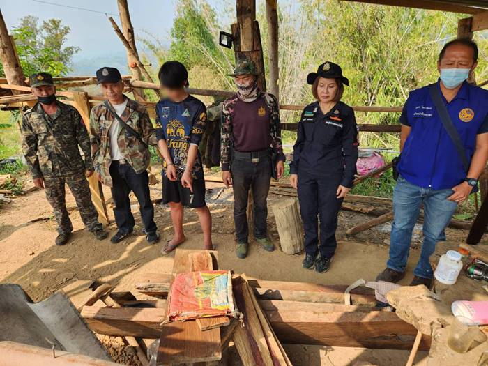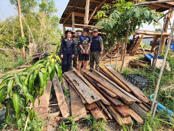 หนุ่มแอบลักลอบและซุกซ่อนไม้ เจ้าหน้าที่เดินเท้า รวบตัวคาที่นอนพร้อมของกลางไม้หวงห้ามอุปกรณ์แปรรูปไม้และอาวุธปืน