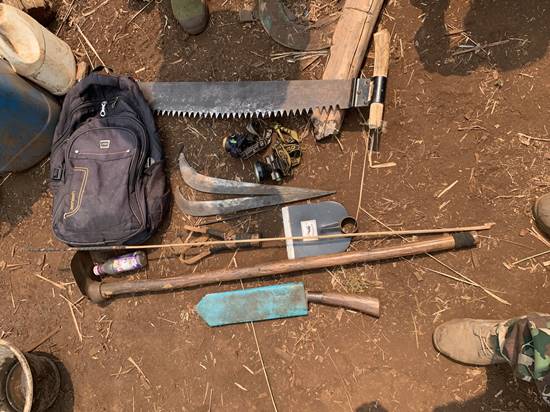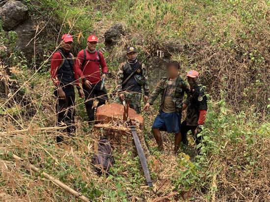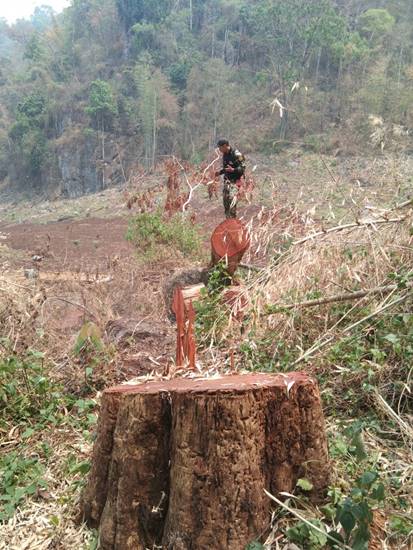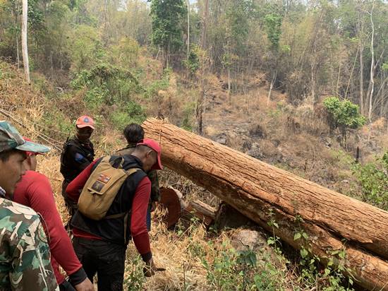และเจ้าหน้าที่ตรวจบริเวณดังกล่าวพบเป็นพื้นที่บุกรุกใหม่มีการโค่นไม้ใหญ่ และเก็บริบสุมเผาไม้และตอไม้ตรวจพบอุปกรณ์การกระทำผิด ประกอบด้วยเลื่อยตัด จำนวน 1 ปื้น ,ไฟแช็ก 1 อัน ,มีด 3 เล่ม ,จอบ 3 เล่ม ,ขวานเล็ก 1 เล่ม และไม้แดงที่ถูกตัดโค่น 1 ต้น ขนาดความโต 250 ซม. ยาว 400 ซม. จำนวน 1 ท่อนปริมาตร 1.99 ลบ.ม. (ขออนุมัติพนักงานสอบสวนทิ้งไม้ของกลางไว้ที่เกิดเหตุ เนื่องจากหากชักลากออกมาจะทำให้พื้นที่ป่าเสียหายเพิ่มขึ้น) เจ้าหน้าที่ได้ตรวจสอบพื้นที่ดังกล่าวไม่ได้อยู่ในโครงการแก้ไขปัญหาที่ดินทำกินในเขตป่าอนุรักษ์ จึงลงความเห็นว่าเป็นการบุกรุกพื้นที่ใหม่จำนวน 13 -1-84ไร่ พิกัดกลางแปลง 47 Q 416981 E 2153455 N
