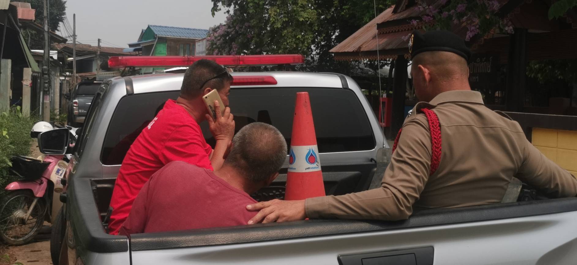……….หลังรับแจ้งจึงนำกำลังพร้อมอาวุธอุปกรณ์ครบมือ โดยมี นายสมศักดิ์ กาเหว่า ผู้ใหญ่บ้านหมู่ที่ 7 ต.หัวฝาย อ.สูงเม่น จ.แพร่ นายสมพร เขียวอ่อน นายสมโภชน์ ขอนเคียน ผู้ช่วยฝ่ายปกครอง ร่วมนำกำลังสนับสนุน เมื่อตำรวจและฝ่ายปกครองไปถึงขบวน รดน้ำดำหัวพบหนุ่มคลุ้มคลั่งทราบชื่อนายโอ๋ อายุ 48 ปี ม.7 ต.หัวฝาย อ.สูงเม่น มีอาการคลุ้มคลั่ง ขี่รถจักรยานยนต์