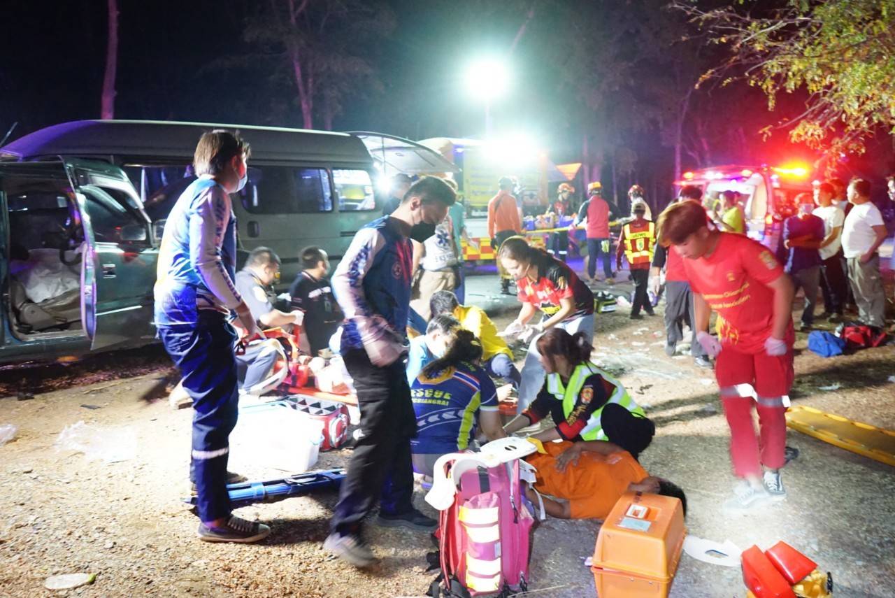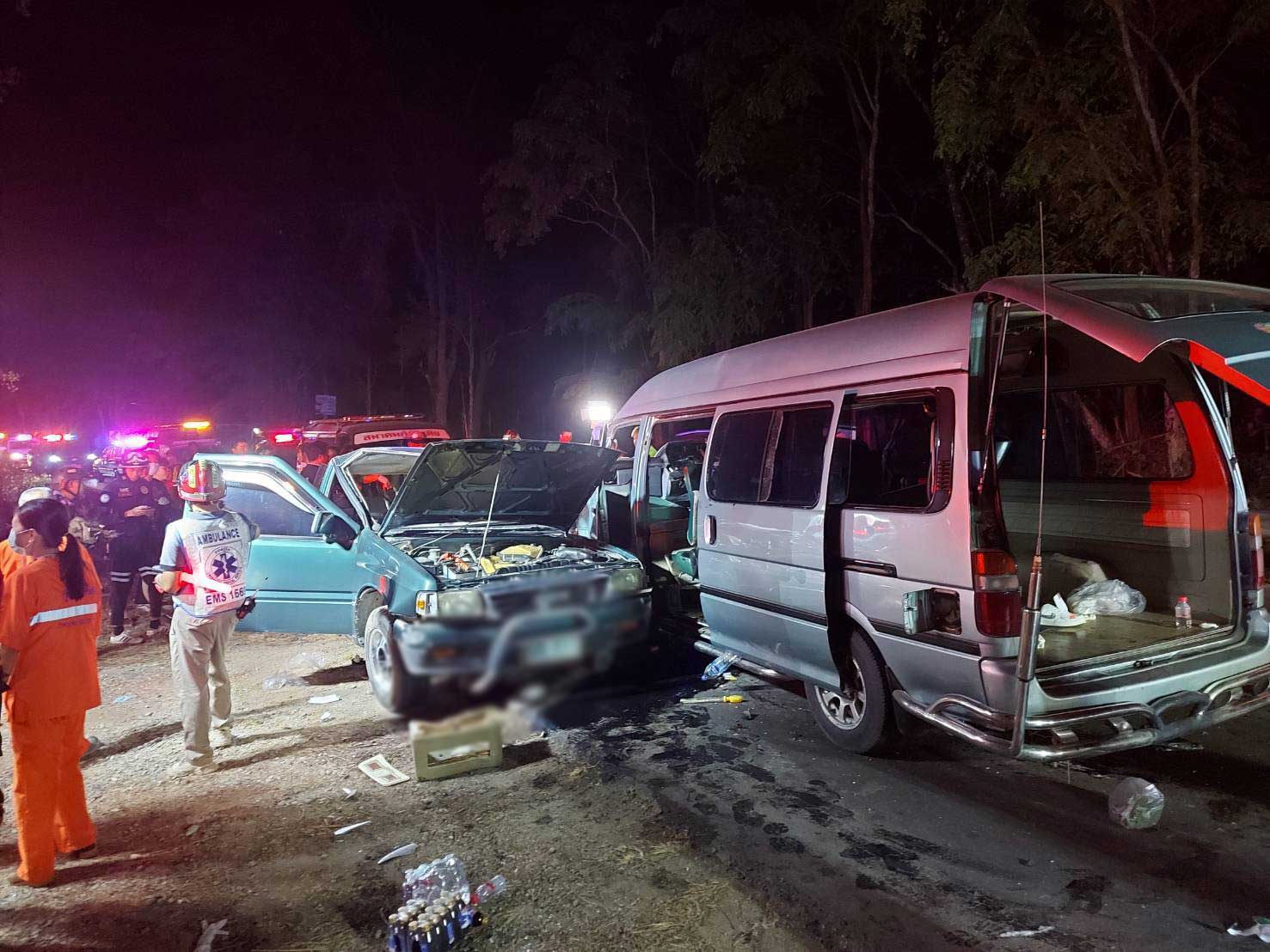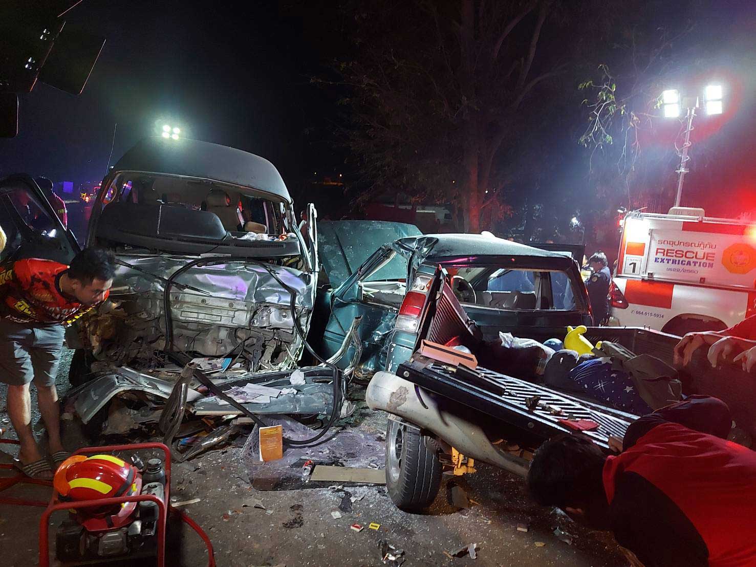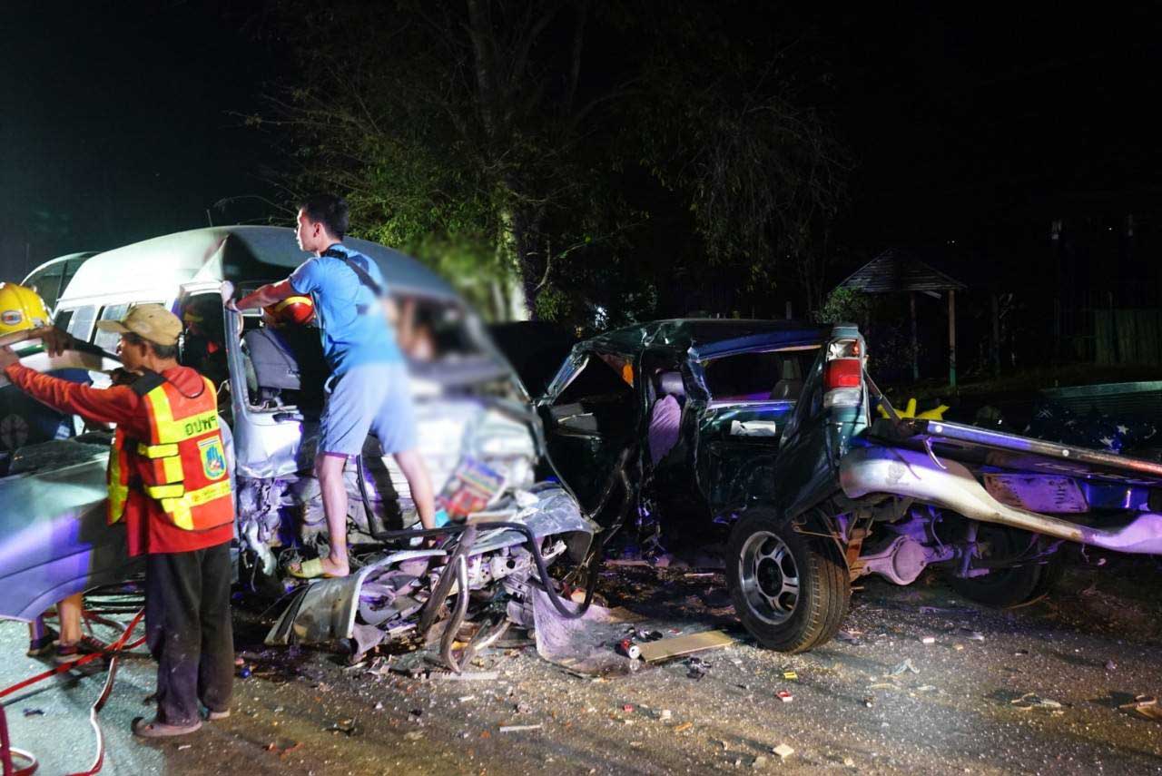 เหตุด่วน! กระบะหลุดโค้งพุ่งข้ามเลนชนกับรถตู้ เบื้องต้นตาย 2 เจ็บ 13 ราย