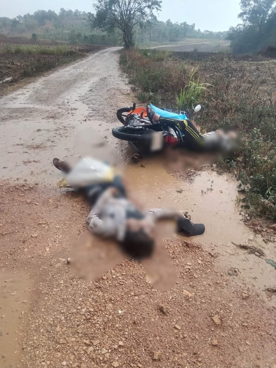 ในที่เกิดเหตุ พบว่ามีผู้เสียชีวิตเป็นชาย 1 ราย เสียชีวิตกลางถนน และหญิง 1 ราย นอนเสียชีวิตบนรถจักรยานยนต์ ไม่พบหลักฐาน เอกสารผู้เสียชีวิตทั้ง 2 คน แต่อย่างใด และพบว่าบนถนนลูกรังที่ผ่านพื้นที่ป่าโล่งแจ้ง บนถนนเจิ่งนองไปด้วยน้ำฝน