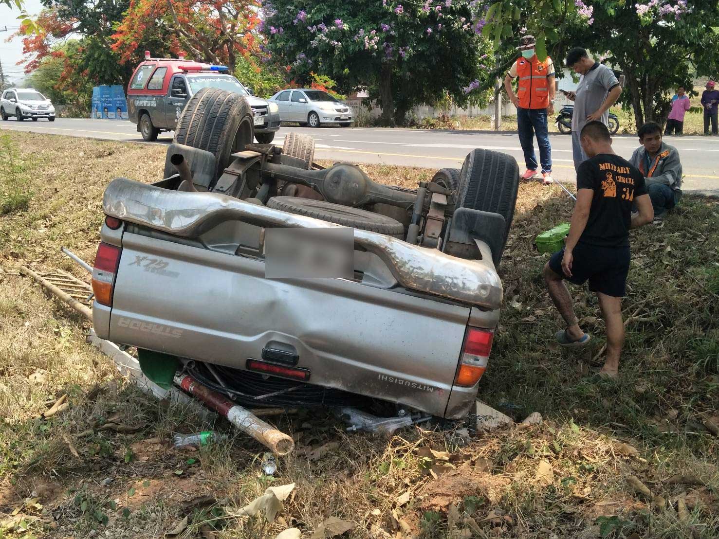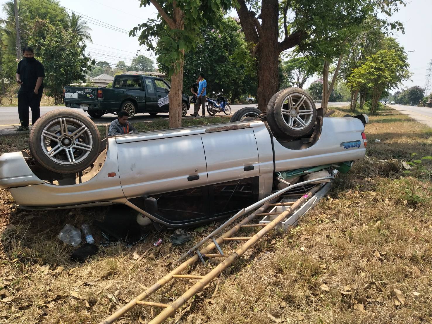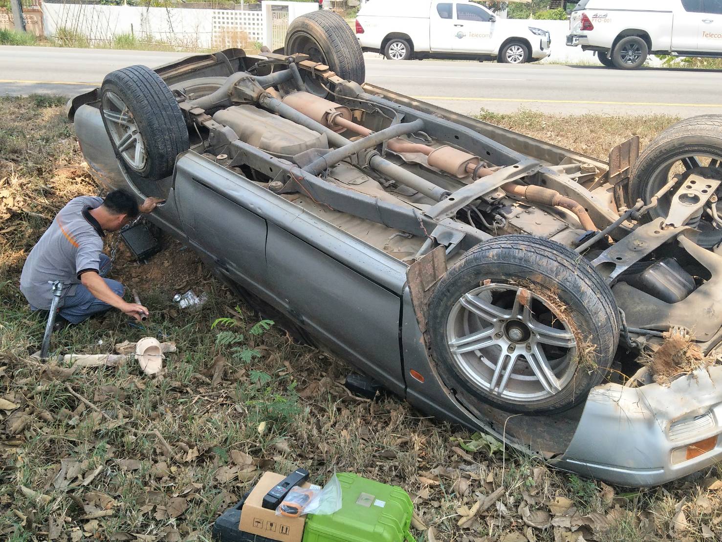 ทั้งนี้ในที่เกิดเหตุพบรถกระบะมิตซูบิชิ สตราด้าหมายเลขทะเบียน กท อุตรดิตถ์พลิกคว่ำหงายท้องชี้ฟ้าสภาพรถเสียหายเกือบทั้งคันพบผู้ได้รับบาดเจ็บ 2 ราย โดยคนขับชื่อนายภูเบศร์อายุ 20 ปี เป็นช่างรับเหมาเดินสายหลักอินเตอร์เน็ตพร้อมเพื่อนที่นั่งมาด้วยกันชื่อนายเอ็มเป็นชาวจังหวัดกำแพงเพชรซึ่งนายภูเบศร์คนขับได้รับบาดเจ็บมีอาการปวดหลังกู้ชีพเทศบาลตำบลบ้านต๊ำและกู้ชีพเทศบาลตำบลแม่ปืมให้การช่วยเหลือเบื้องต้นก่อนนำส่งโรงพยาบาลพะเยา