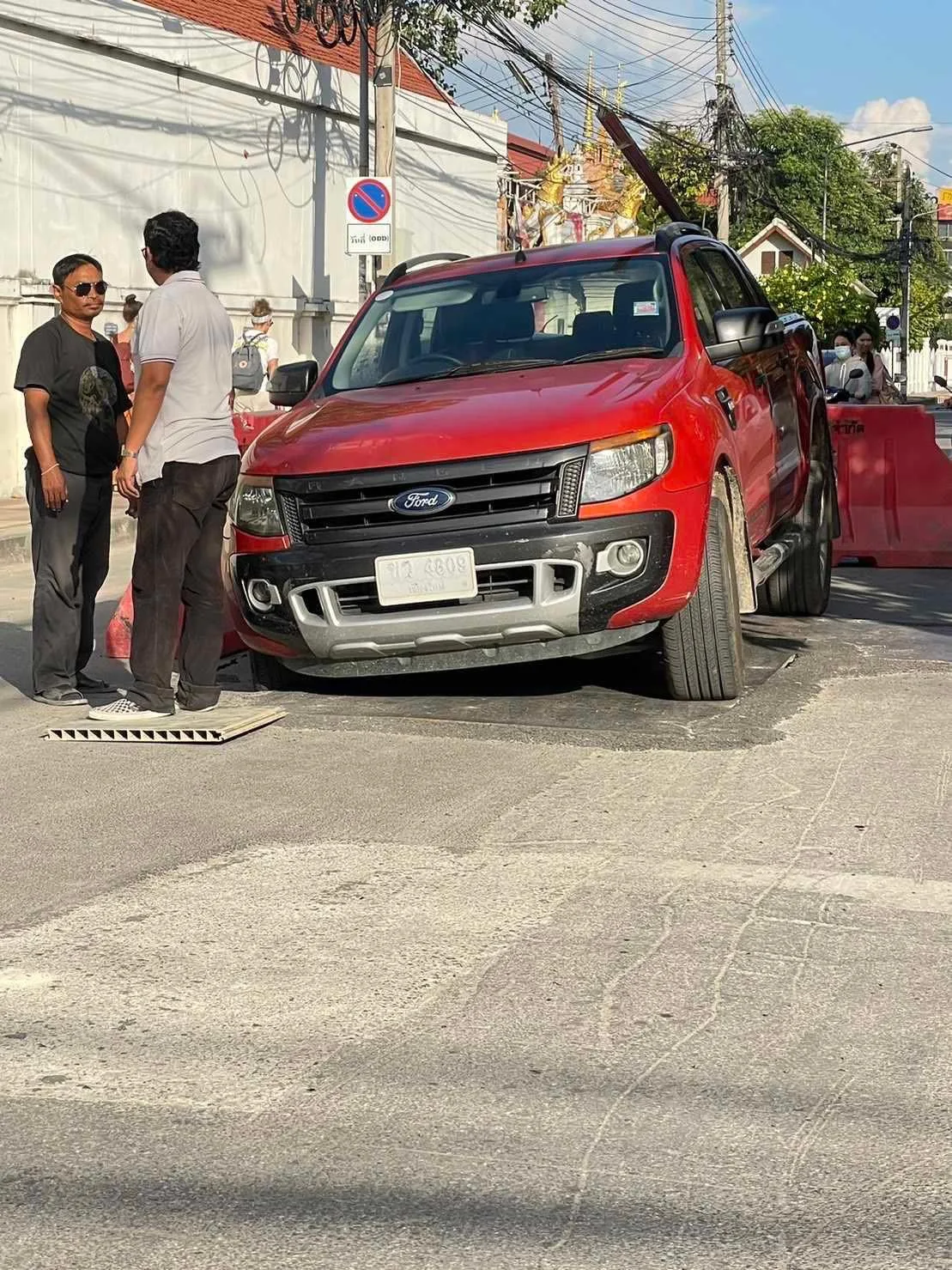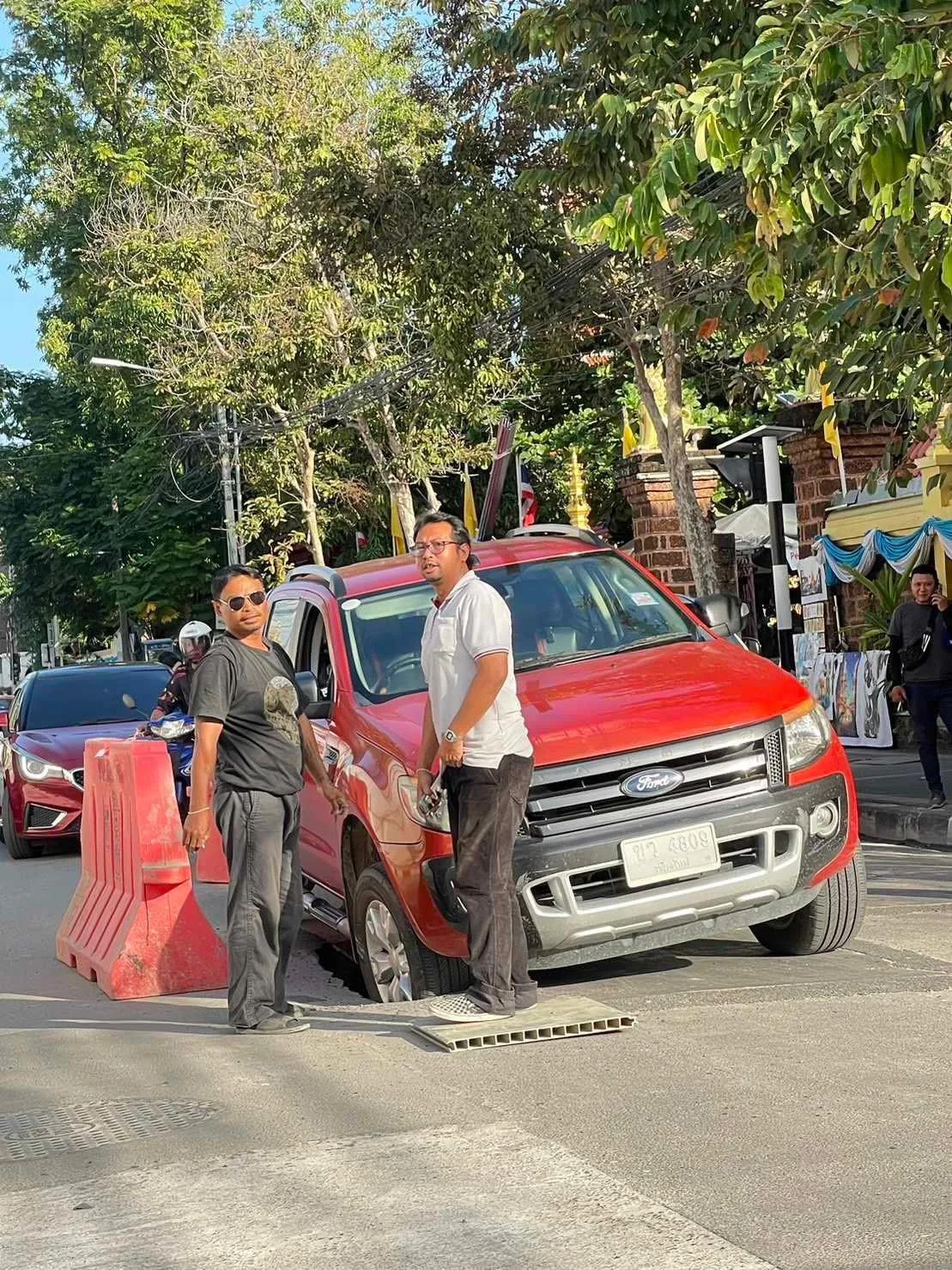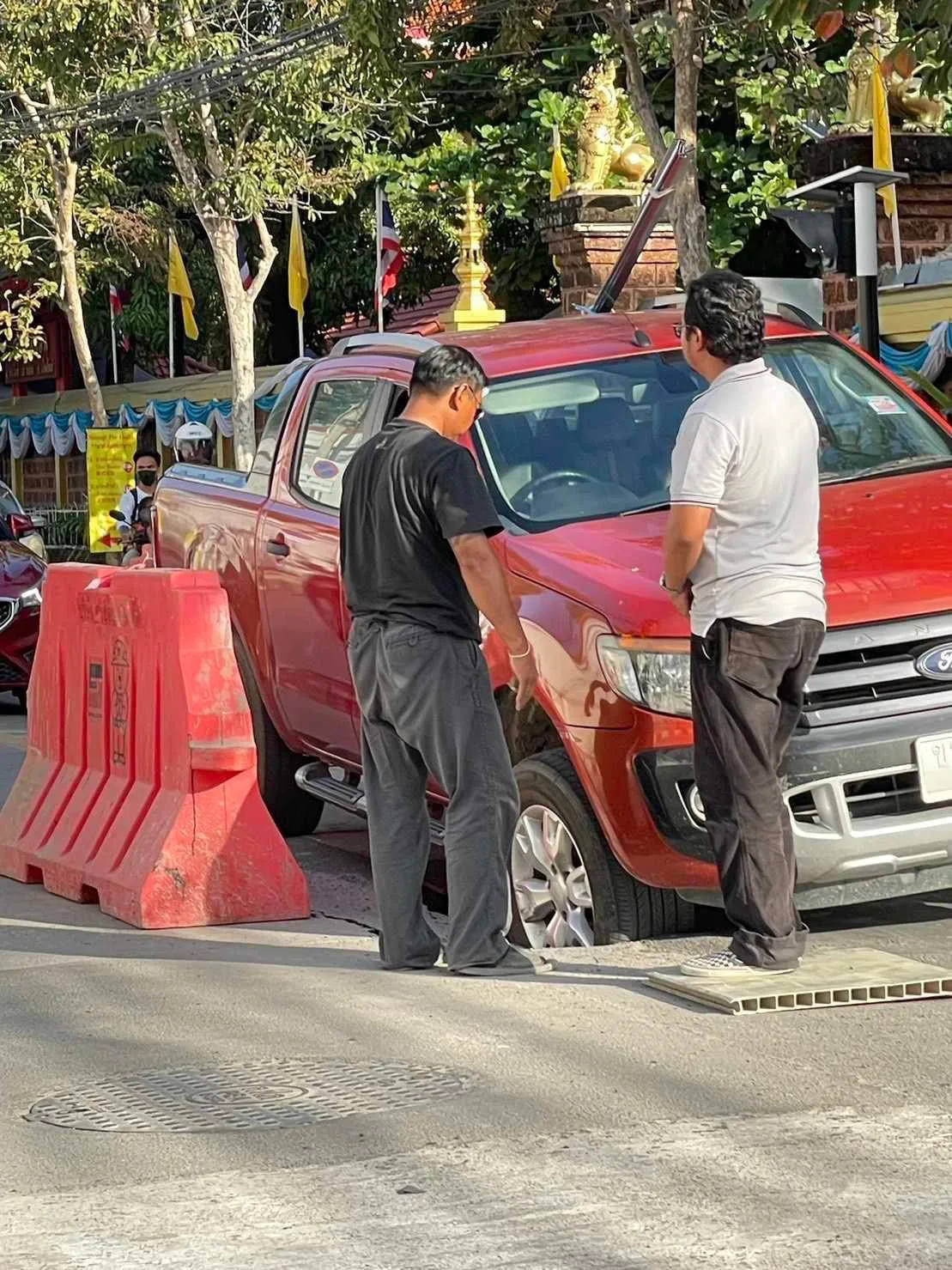 ทาง คุณเอก เล่าว่าขณะที่ตนกำลังขับรถเข้าบ้านพักในย่านนั้นพบว่ามีรถกระบะคันหนึ่งล้อหน้าด้านขวาตกลงไปในหลุมงานวางท่อสายไฟใต้ดิน ชึ่งไม่มีอะไรปิดปลาหลุมไว้ จึงเป็นอุทาหรณ์สำหรับผู้ใช้รถใช้ถนน อุบัติเหตุเกิดขึ้นได้ทุกเวลาใช้รถใช้ถนนด้วยรวามระมัดระวังด้วยครับ