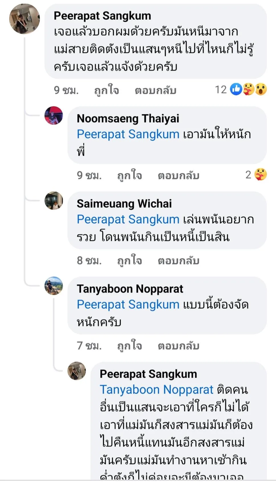 ซึ่งกลังจากโพสต์ดังกล่าวได้เผยแพร่ออกไป ก็มีผู้เข้ามาแสดงความคิดเห็นเป็นจำนวนมาก โดยเฉพาะพ่อค้าแม่ค้าร้านอาหารตามสั่ง ที่แจ้งว่าถูกบุคคลคนเดียวกันนี้เข้ามาสั่งอาหาร และลุกเดินหนี ไม่ยอมจ่ายเงินเช่นเดียวกัน และบางคนก็มาแจ้งเบาะแสว่าบุคคลดังกล่าวหนีหนี้พนันนับแสนบาทมาจาก อ.แม่สาย จ.เชียงราย โดยส่วนใหญ่อยากให้จับตัวชายดังกล่าวมาดำเนินคดี เพราะมีพ่อค้าแม่ค้าได้รับความเดือดร้อนเป็นจำนวนมาก
