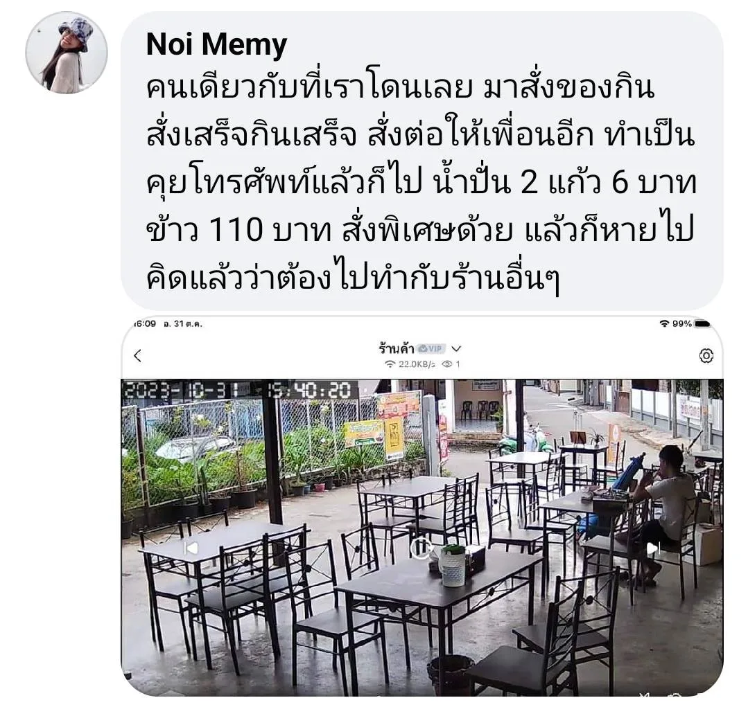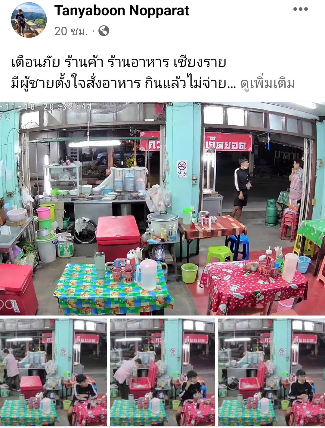 วันที่ 17 พ.ย. 66 ผู้สื่อข่าวติดตามกรณีผู้ใช้เฟสบุ๊กชื่อ “Tanyaboon Nopparat” ได้โพสต์คลิปและภาพเพื่อเตือนภัยสังคม โดยมีข้อความระบุว่า “เตือนภัย ร้านค้า ร้านอาหาร เชียงราย มีผู้ชายตั้งใจสั่งอาหาร กินแล้วไม่จ่าย วิธีการสั่งกินในร้านก่อน กินเสร็จจะสั่งกลับบ้าน