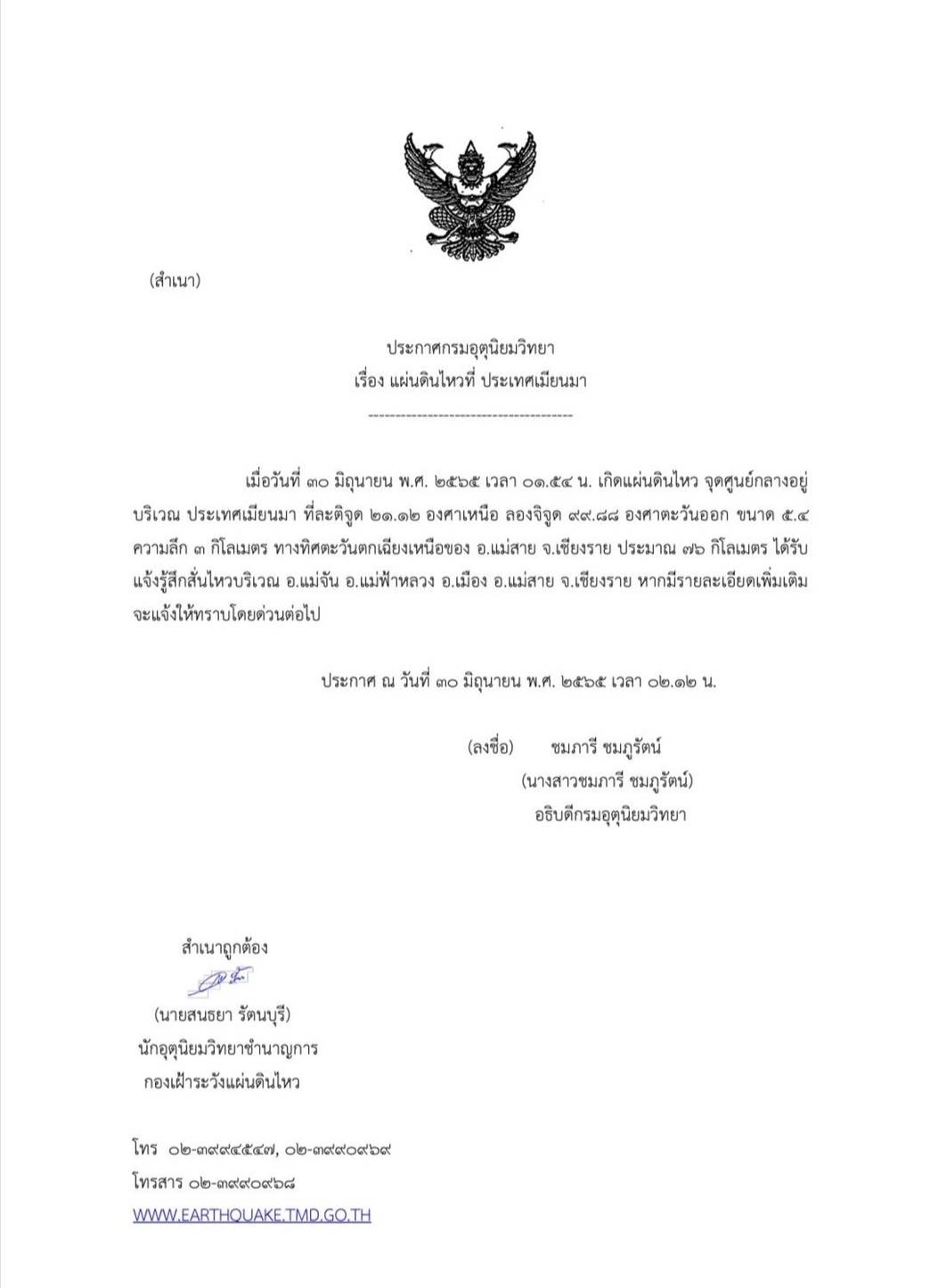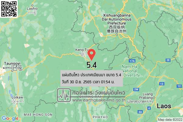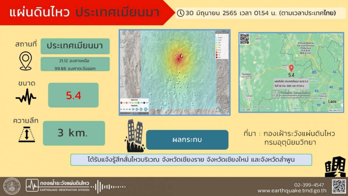 เมื่อวันที่ 30 มิ.ย. 65 เกิดเหตุแผ่นดินไหวในประเทศเมียนมาอย่างต่อเนื่อง ขนาดตั้งแต่ 2.1 ริกเตอร์ รุนแรงสุดที่ 5.4 ริกเตอร์ สามารถรับรู้แรงสั่นสะเทือนได้ในหลายพื้นที่ของ จ.เชียงราย
