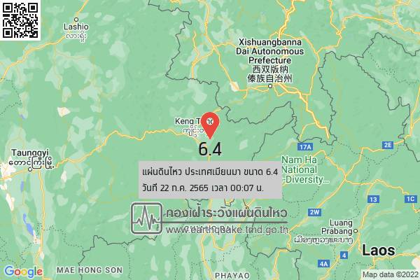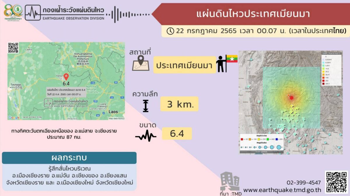 วันที่ 22 ก.ค. 65 ผู้สื่อข่าวรายงานว่า ประเทศเมียนมา ยังประสบเหตุแผ่นดินไหวอย่างต่อเนื่อง โดยเว็บไซต์กองเฝ้าระวังแผ่นดินไหว กรมอุตุนิยมวิทยา แจ้งสถานการณ์แผ่นดินไหวในประเทศเมียนมา นับตั้งแต่เวลา 00.06 น. – 07.10 น. ของวันที่ 22 ก.ค. 65 มีเหตุแผ่นดินไหวเกิดขึ้นรวม 47 ครั้ง ความรุนแรงตั้งแต่ 2.4 ริกเตอร์ ไปจนถึงแรงสุดถึง 6.4 เมื่อเวลา 00.07 น. จุดศูนย์กลางที่ประเทศเมียนมา ห่างชายแดนแม่สายแค่ 87 กม.