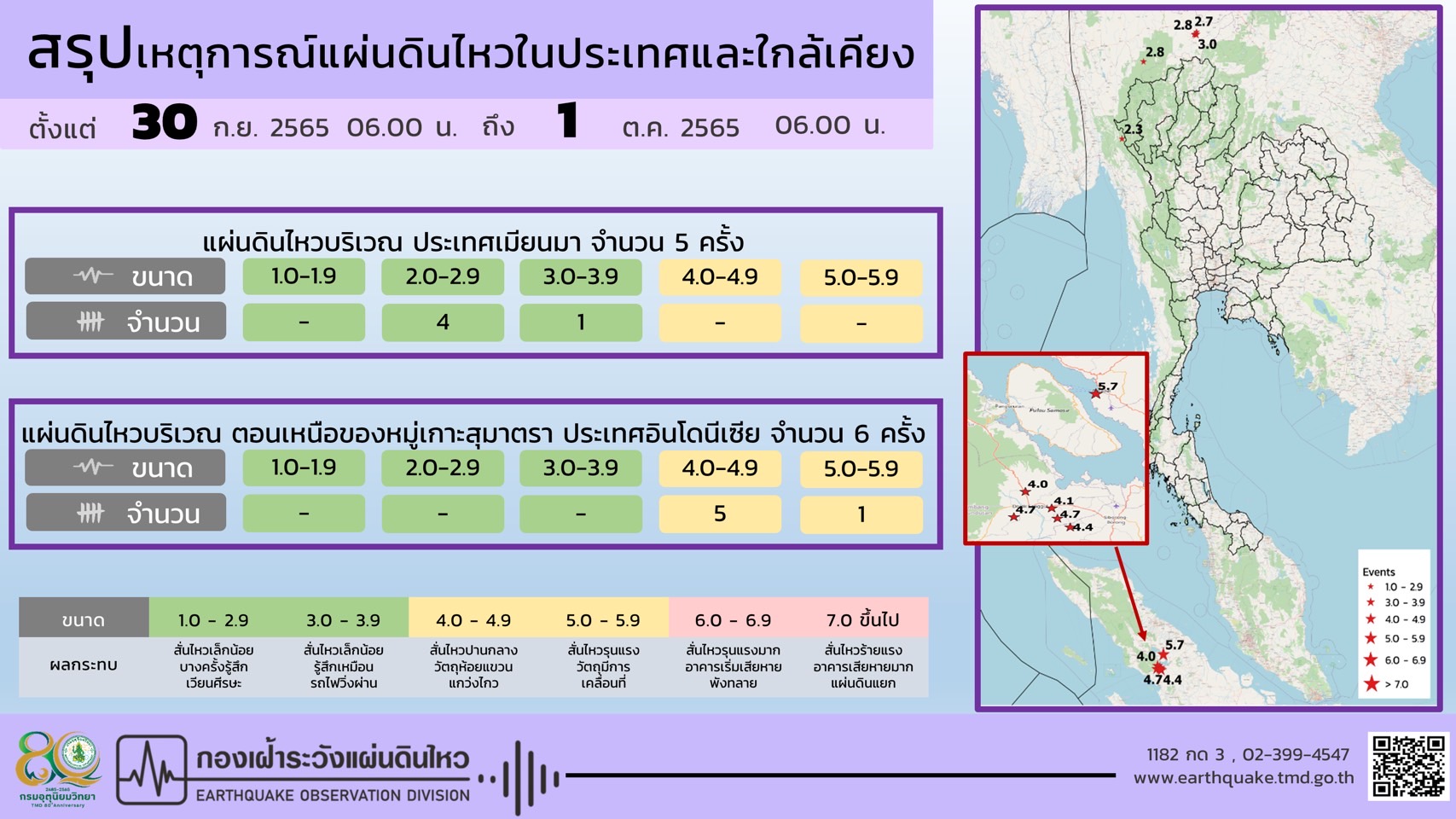 สำหรับสถานการณ์แผ่นดินไหวในช่วงวันที่ 30 กันยายน-1 ตุลาคม 2565 ตรวจพบเหตุการณ์แผ่นดินไหว ขนาด 2.7, 2.3, 2.8, 2.8, 3.0 มีศูนย์กลางอยู่ที่ประเทศเมียนมา และ ขนาด 5.7, 4.7, 4.4, 4.7, 4.0, 4.1 มีศูนย์กลางอยู่ที่ตอนเหนือของหมู่เกาะสุมาตรา ประเทศอินโดนีเซีย ไม่มีผลกระทบต่อประเทศไทยแต่อย่างใด