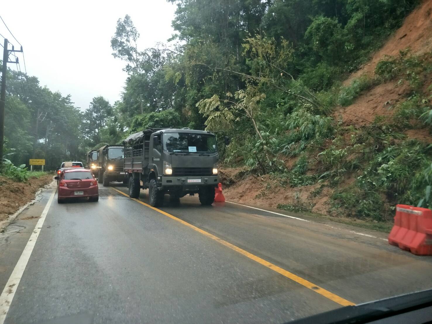 นางสาวศิริอร รังศิริตานนท์ ผู้ประกอบการนำเที่ยวของจังหวัดแม่ฮ่องสอน ที่นำนักท่องเที่ยว และผู้ประกอบการ ในแม่ฮ่องสอน เดินทางไปส่งยังจังหวัดเชียงใหม่ เปิดเผยว่า ในระหว่างเดินทางไปยังเชียงใหม่ เมื่อมาถึงบริเวณเลยด่านแม่ยะ เขต อ.ปาย จ.แม่ฮ่องสอน ได้มีดินสไลด์ลงปิดทับเส้นทาง และขบวนรถ ต้องติดบริเวณดังกล่าวนานกว่า 2 ชั่วโมง เนื่องจากต้องรอให้มีการตัดต้นไม้และตักดินออกจากผิวถนน และรถสามารถวิ่งผ่านได้เพียงช่องทางเดียว ทั้งนี้ ตลอดเส้นทาง ตั้งแต่ ด่านแม่ยะ อ.ปาย จ.แม่ฮ่องสอน มีดินสไลด์ลงปิดทับเส้นทางเป็นจำนวนมาก ไปจนถึงบริเวณน้ำตกหมอกฟ้า ก็ต้องประสบกับน้ำท่วมผิวถนนและรถต้องจอดรอทุกคัน ทั้งนี้ มีรถที่ใช้เส้นทางดังกล่าว เกือบร้อยคัน ที่ต้องประสบกับปัญหาในการเดินทาง