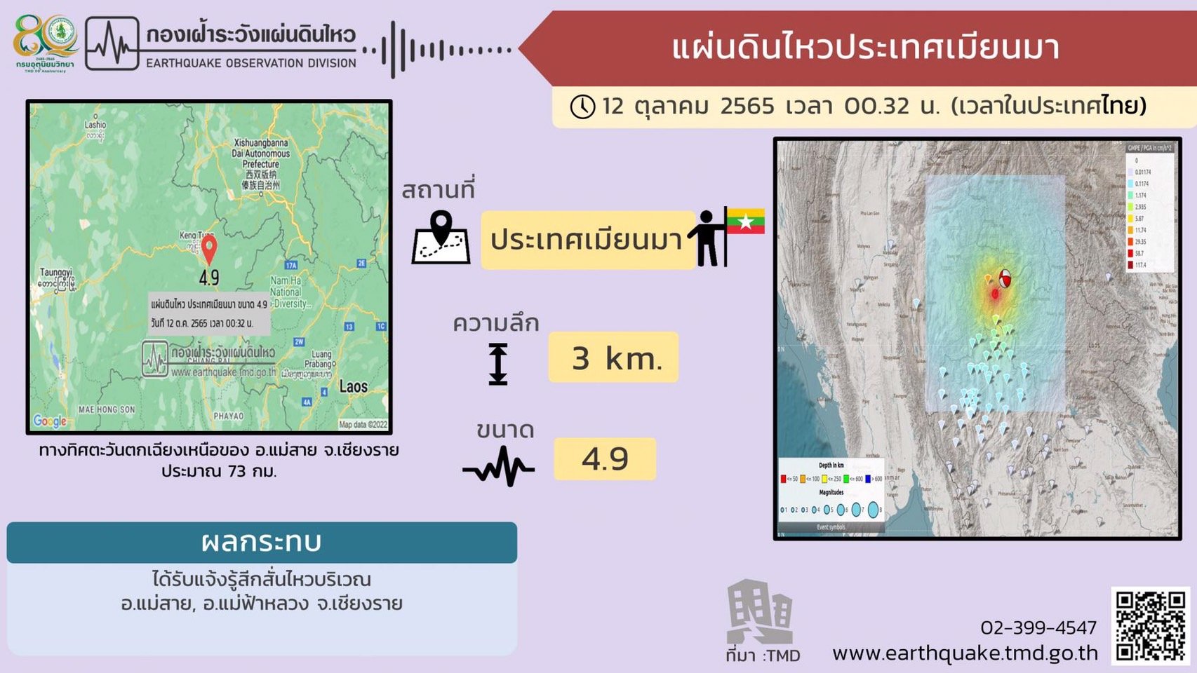วันพุธที่ 12 ตุลาคม พ.ศ. 2565 แผ่นดินไหวประเทศเมียนมา Myanmar เวลา 00:32 น. ตามเวลาประเทศไทย (2022-10-11 17:32:44 UTC) ขนาด 4.9 ลึก 3 กม. Epicenter (21.094°,99.845°) ทางทิศตะวันตกเฉียงเหนือของ อ.แม่สาย จ.เชียงราย ประมาณ 73 กม.