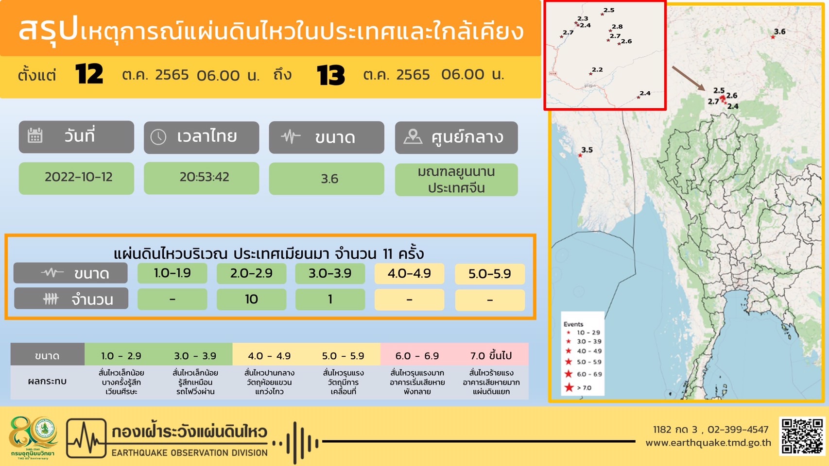 สำหรับสถานการณ์แผ่นดินไหวในช่วงวันที่ 12-13 ตุลาคม 2565 ตรวจพบเหตุการณ์แผ่นดินไหว ขนาด 2.0-2.9 จำนวน 10 ครั้ง, ขนาด 3.0-3.9 จำนวน 1 ครั้ง มีศูนย์กลางอยู่ที่ประเทศเมียนมา ขนาด 3.6 มีศูนย์กลางอยู่ที่มณฑลยูนนาน, ประเทศจีน ไม่มีผลกระทบต่อประเทศไทยแต่อย่างใด