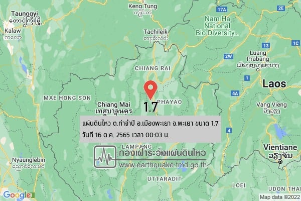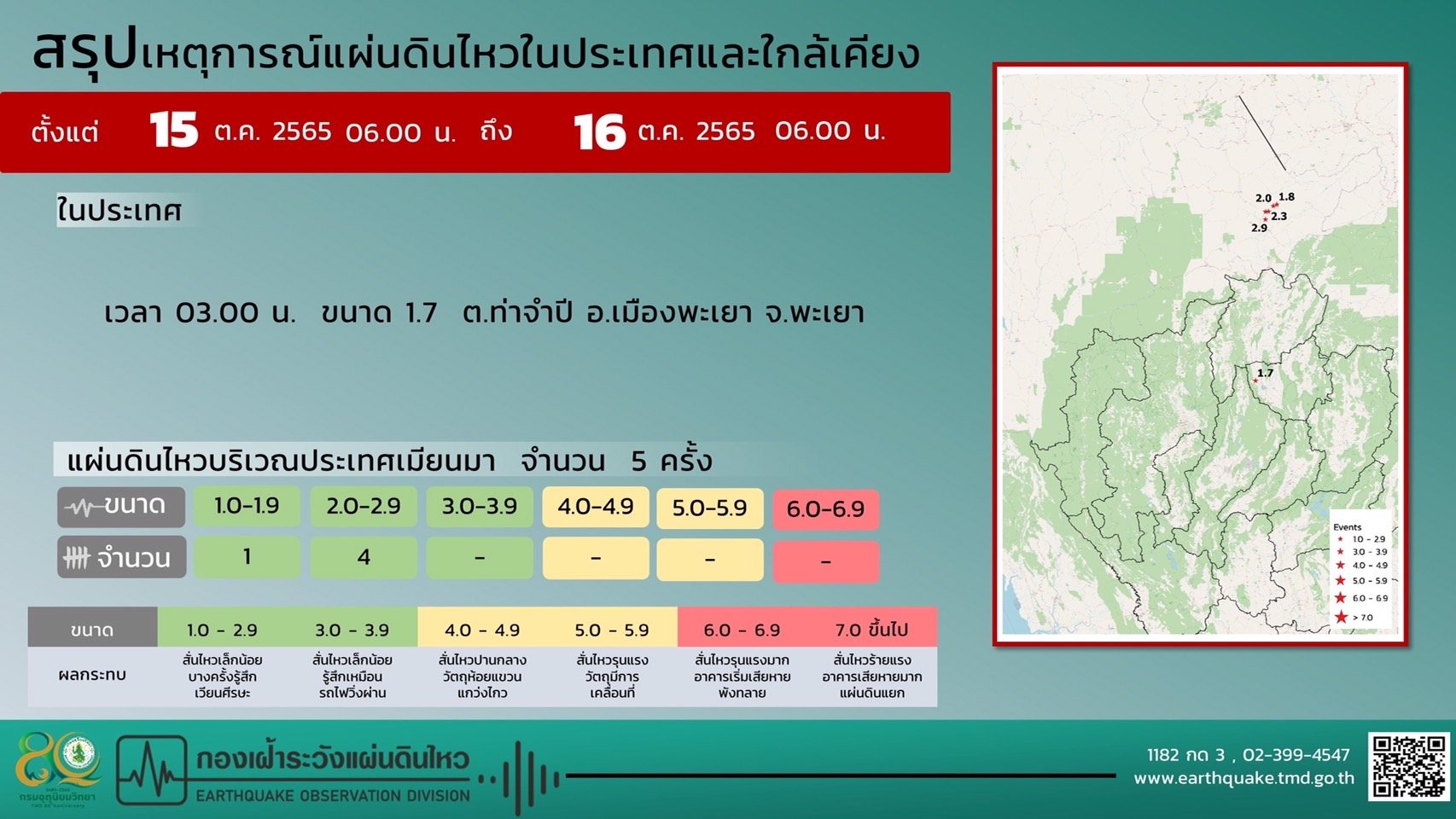 สำหรับสถานการณ์แผ่นดินไหวในช่วงวันที่ 15-16 ตุลาคม 2565 ตรวจพบเหตุการณ์แผ่นดินไหว ขนาด 1.8 – 2.9 มีศูนย์กลางอยู่ที่ประเทศเมียนมา จำนวน 5 ครั้ง และขนาด 1.7 มีศูนย์กลางอยู่ที่ต.ท่าจำปี อ.เมืองพะเยา จ.พะเยา ไม่มีผลกระทบต่อประเทศไทยแต่อย่างใด