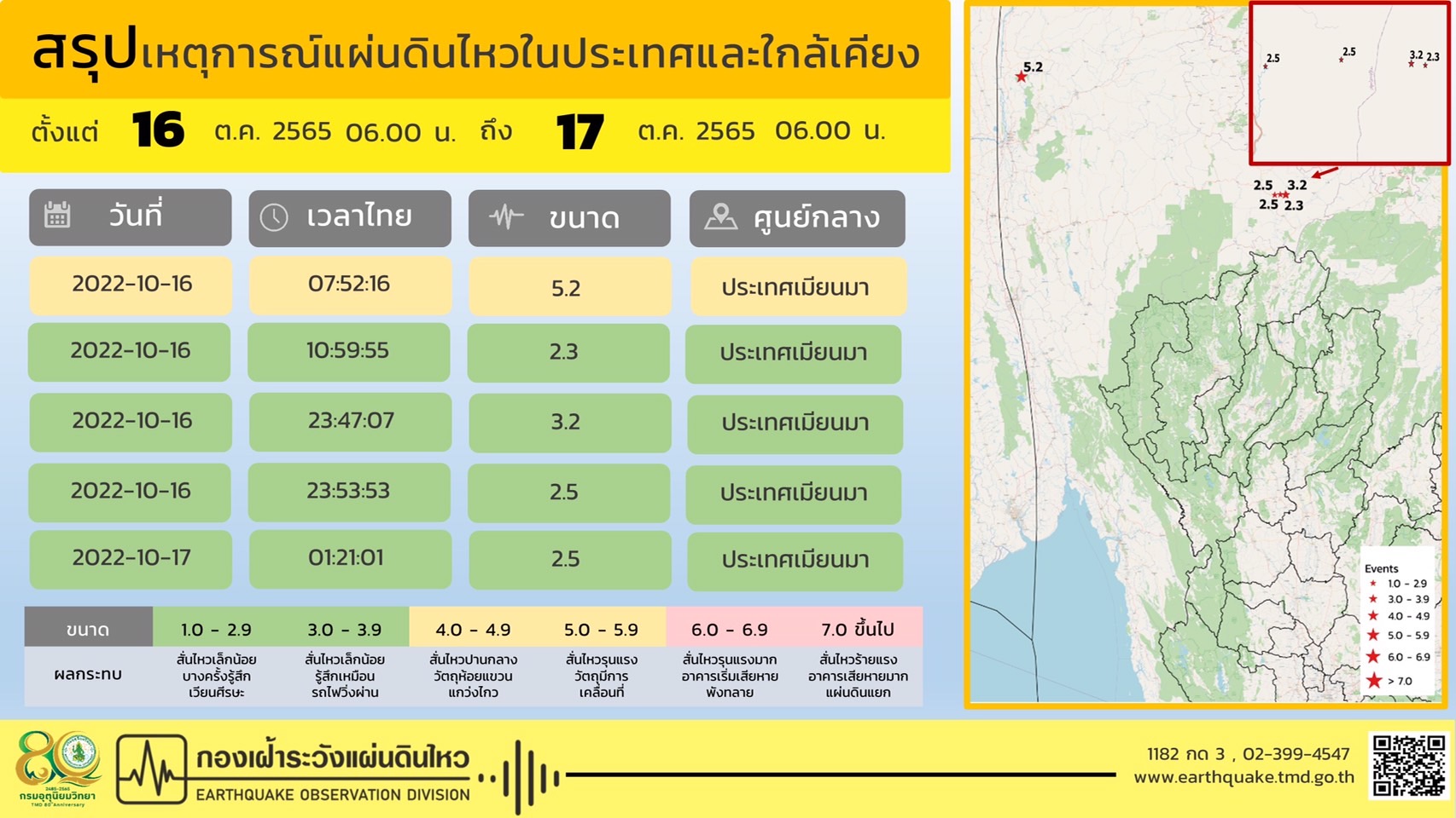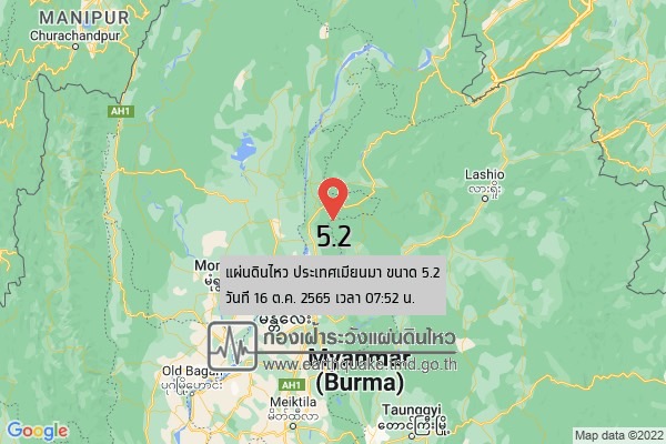 สำหรับสถานการณ์แผ่นดินไหวในช่วงวันที่ 16-17 ตุลาคม 2565 ตรวจพบเหตุการณ์แผ่นดินไหว จำนวน 5 ครั้ง มีศูนย์กลางอยู่ที่ประเทศเมียนมา ไม่มีผลกระทบต่อประเทศไทยแต่อย่างใด ขนาด 5.2 ทางทิศตะวันตกเฉียงเหนือของ อ.ปางมะผ้า จ.แม่ฮ่องสอน ประมาณ 415 กม.ขนาด2.3 ทางทิศตะวันออกเฉียงเหนือของ อ.แม่สาย จ.เชียงราย ประมาณ 83 กม.ขนาด 3.2 ทางทิศตะวันออกเฉียงเหนือของ อ.แม่สาย จ.เชียงราย ประมาณ 81 กม. ขนาด 2.5 ทางทิศตะวันตกเฉียงเหนือของ อ.แม่สาย จ.เชียงราย ประมาณ 80 กม. และขนาด 2.5 ทางทิศตะวันออกเฉียงเหนือของ อ.แม่สาย จ.เชียงราย ประมาณ 81 กม.