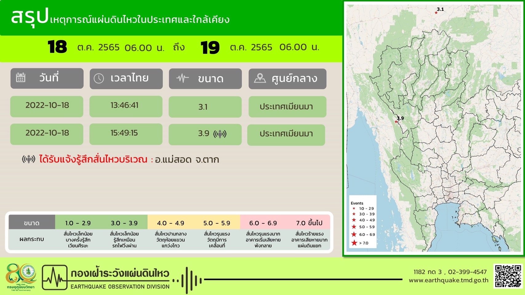 สำหรับสถานการณ์แผ่นดินไหวในช่วงวันที่ 18-19 ตุลาคม 2565 ตรวจพบเหตุการณ์แผ่นดินไหว ขนาด 3.1 มีศูนย์กลางอยู่ที่ประเทศเมียนมา และขนาด 3.9 มีศูนย์กลางอยู่ที่ประเทศเมียนมา ได้รับแจ้งรู้สึกสั่นไหวบริเวณ อ.แม่สอด จ.ตาก